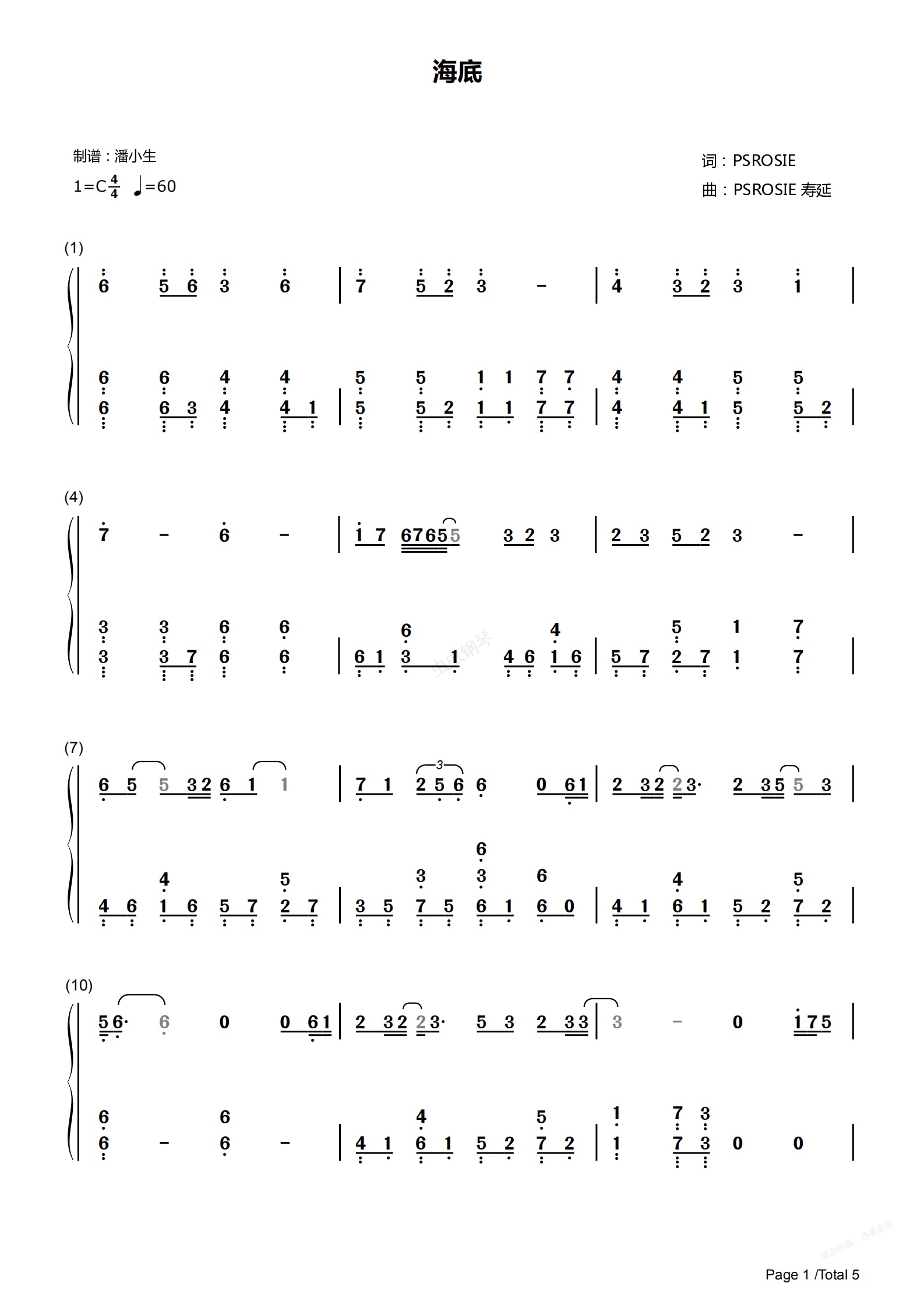 钢琴谱:[双手简谱] 海底 C调 深情 完美版 一支榴莲