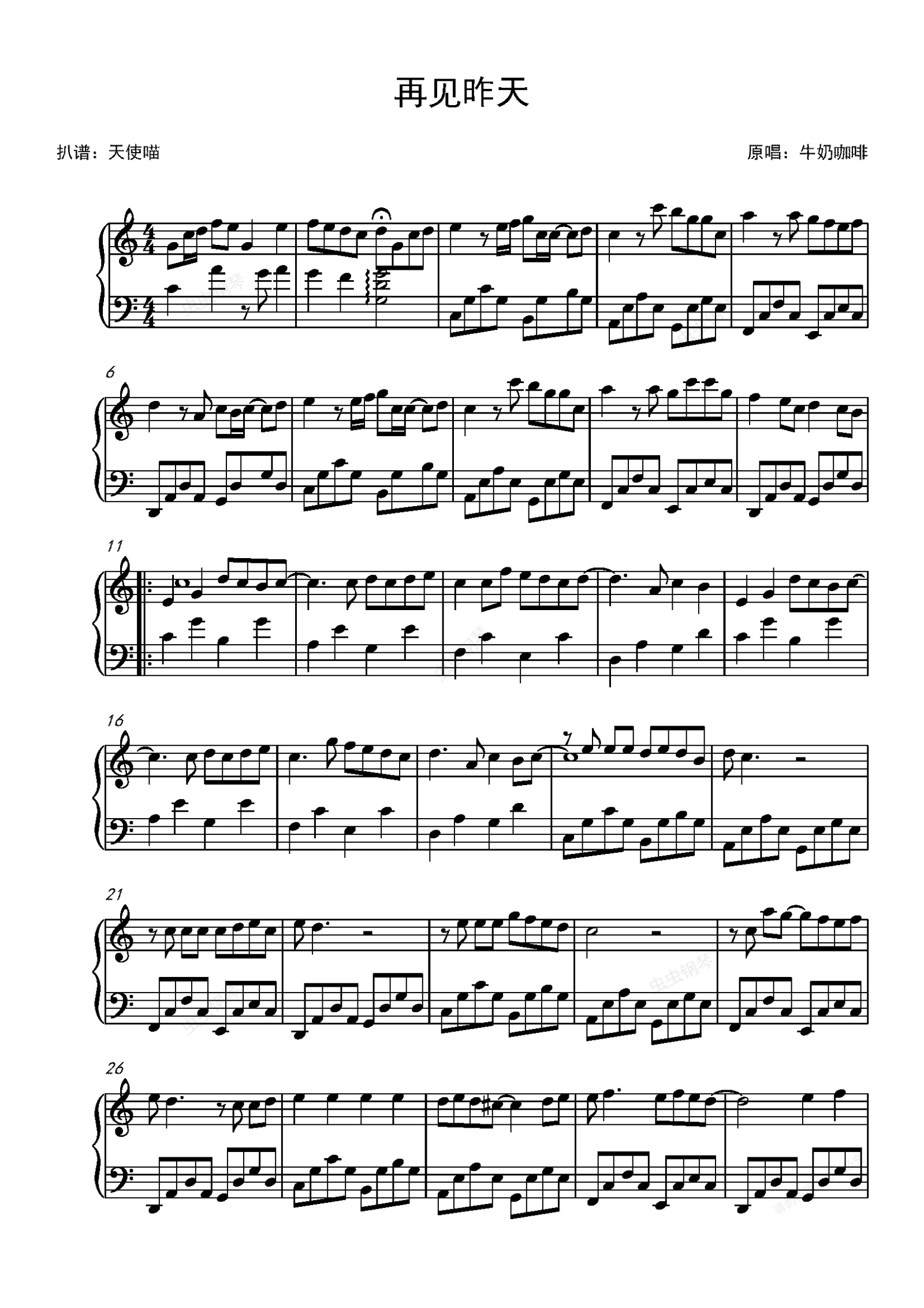 钢琴谱:《昨日青空》再见昨天-牛奶咖啡(C调)