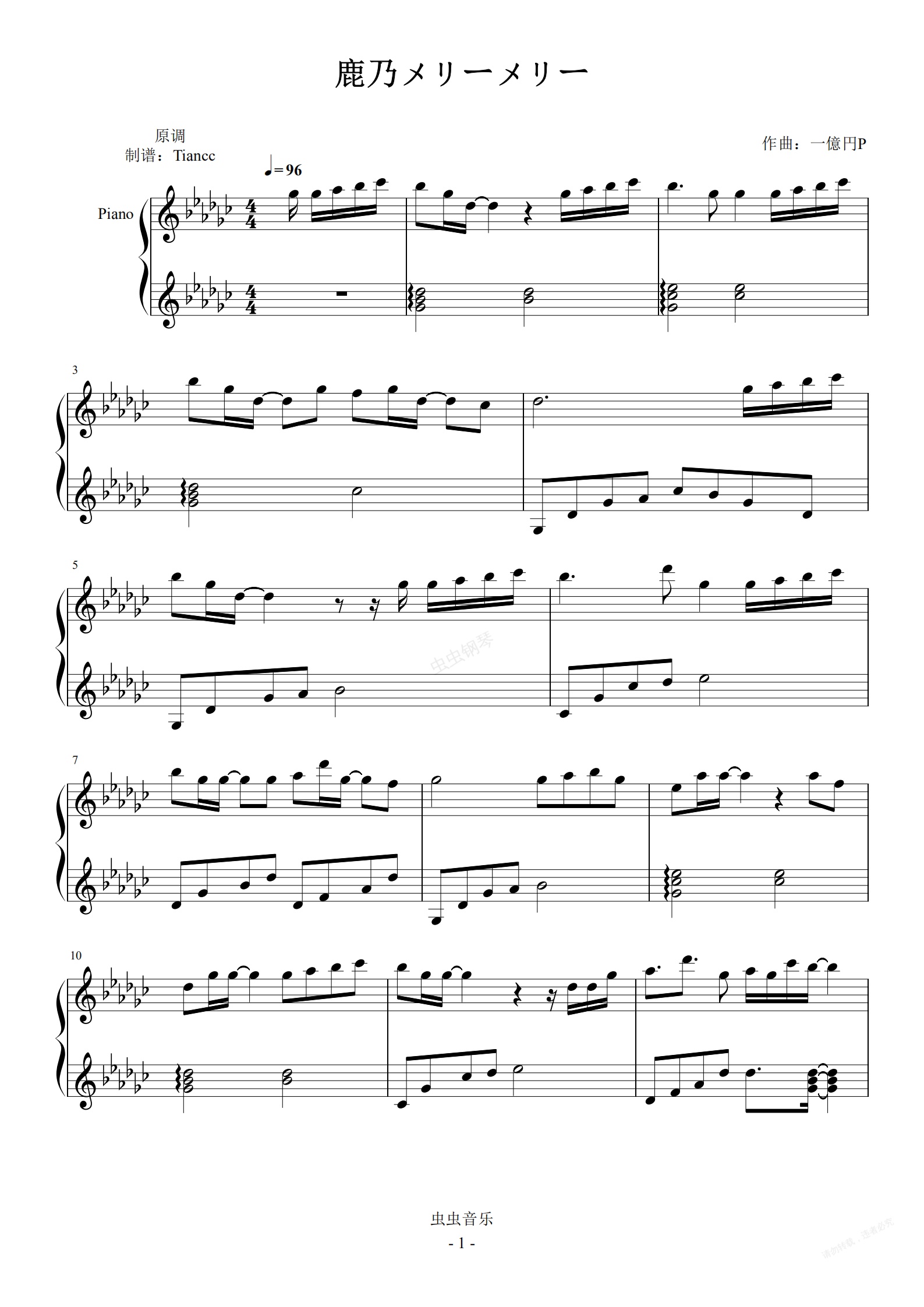 钢琴谱:《鹿乃メリーメリー》(原调),完美可弹谱