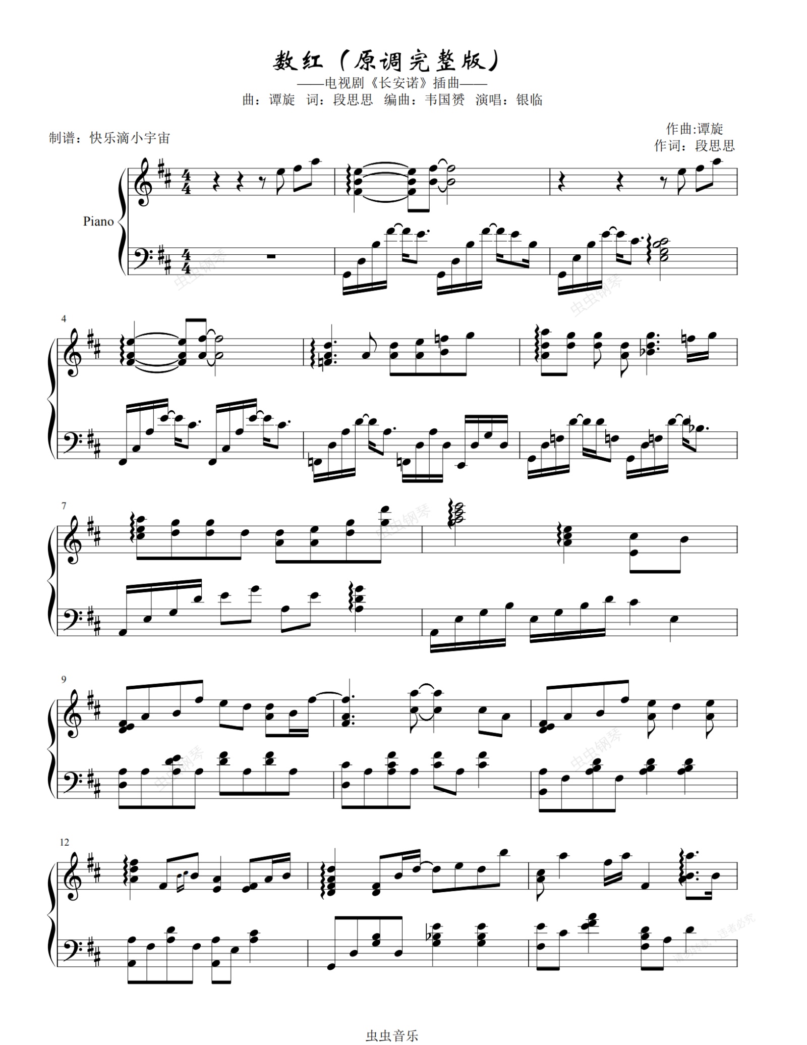 钢琴谱:数红(原调完整版)-银临(电视剧《长安诺》插曲)