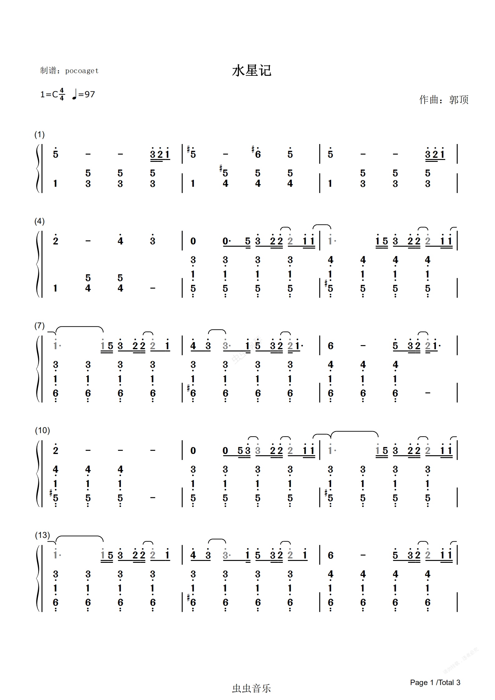 钢琴谱:郭顶《水星记》简谱初学者版(poc编配)
