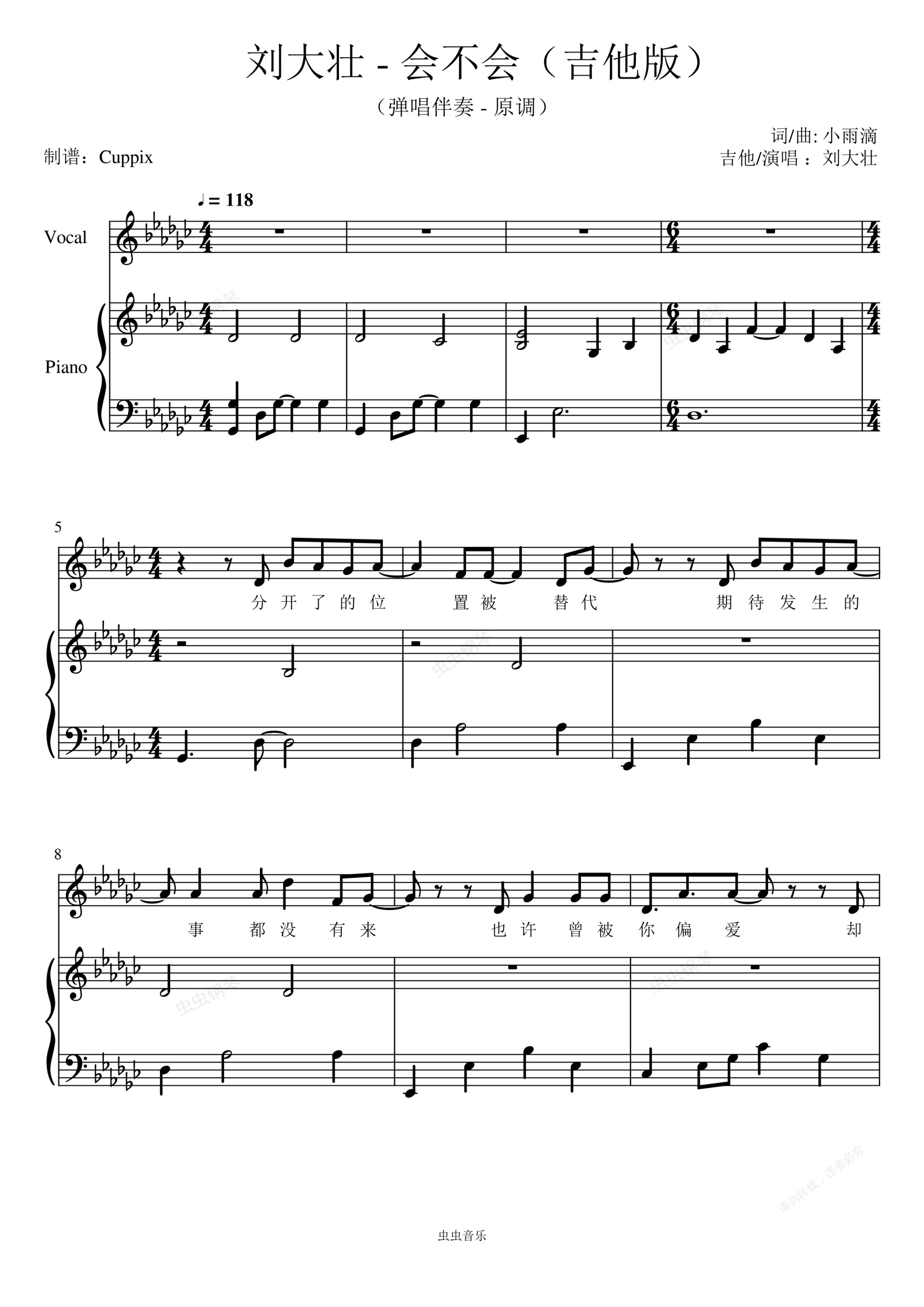 钢琴谱:刘大壮《会不会 (吉他版)》弹唱伴奏附词 - 原调 - 高度还原