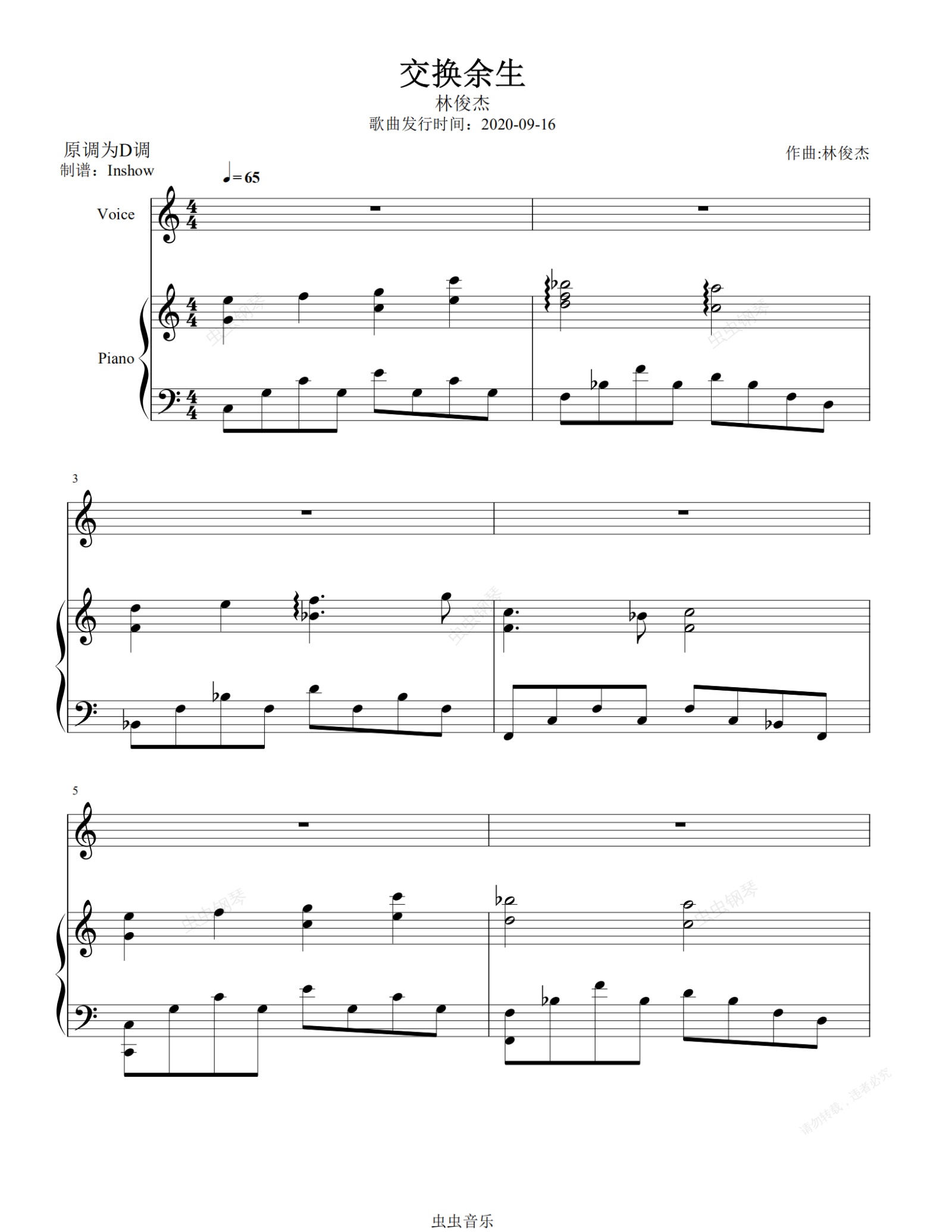 钢琴谱:交换余生【C调简易弹唱谱】