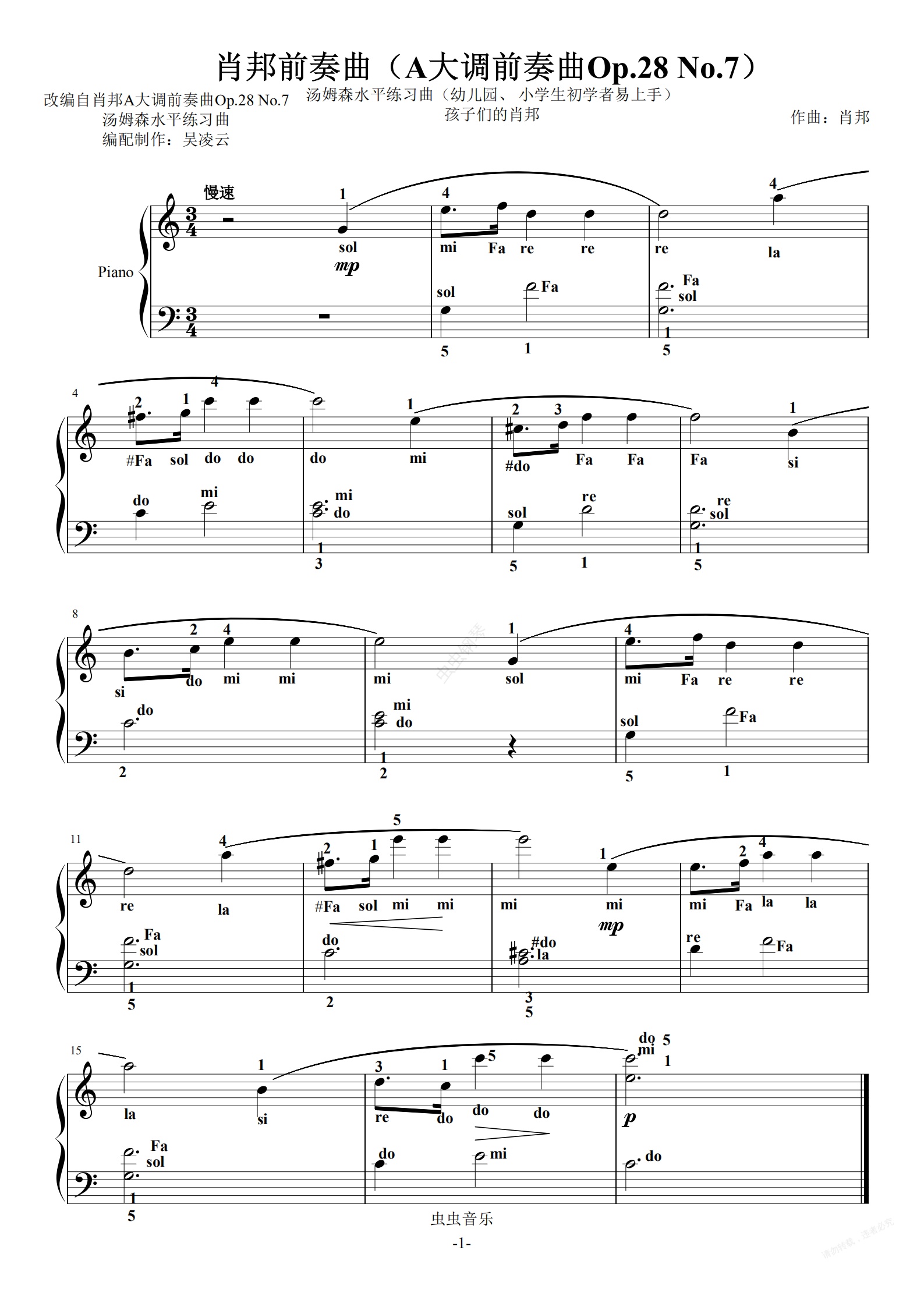 钢琴谱:肖邦前奏曲 Op.28-7 汤姆森水平标音带指法 幼儿园小学生初学易上手 吴凌云现代钢琴基础教程选曲