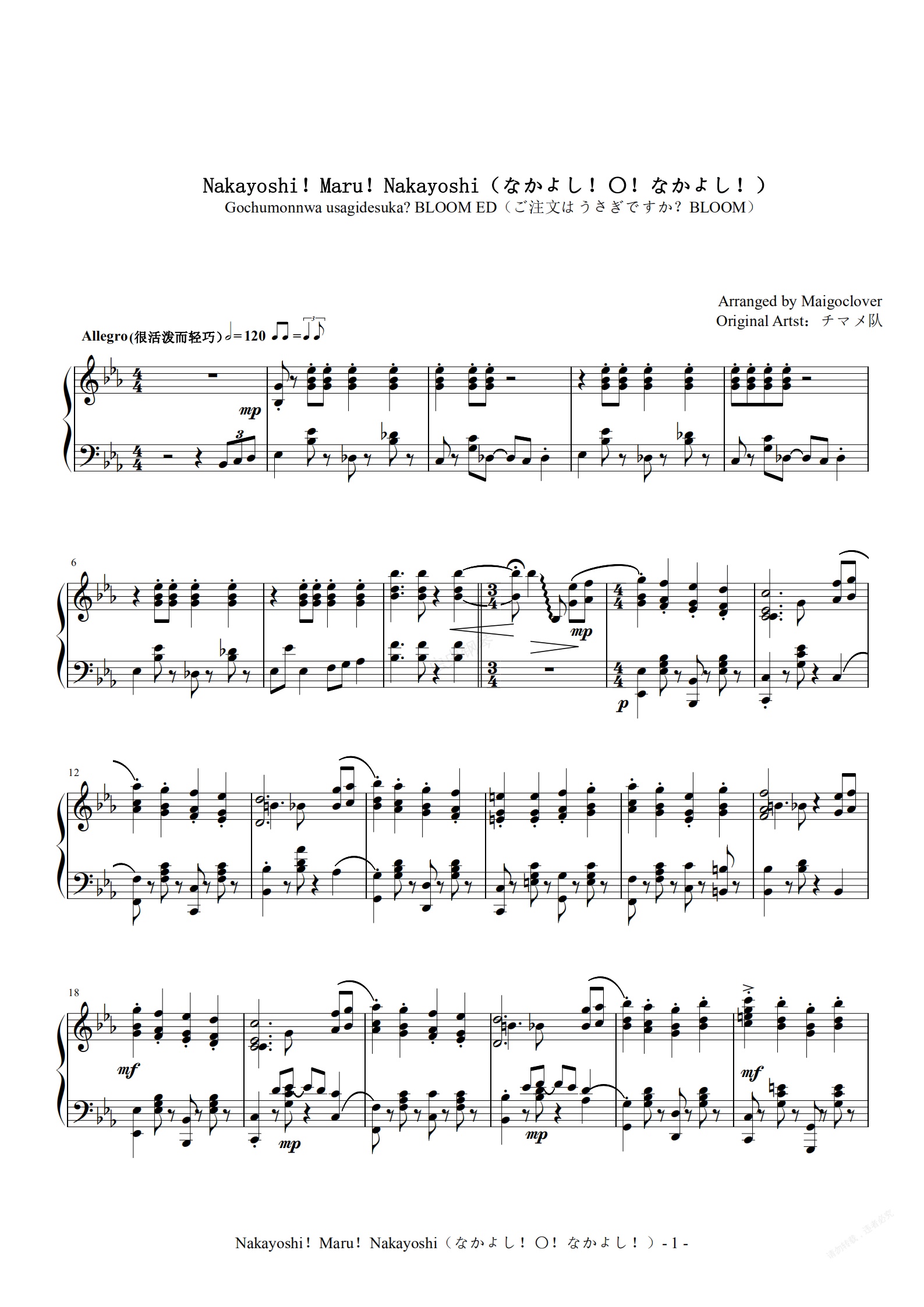 钢琴谱:なかよし!〇!なかよし!(请问您今天要来点兔子吗?BLOOM ED)