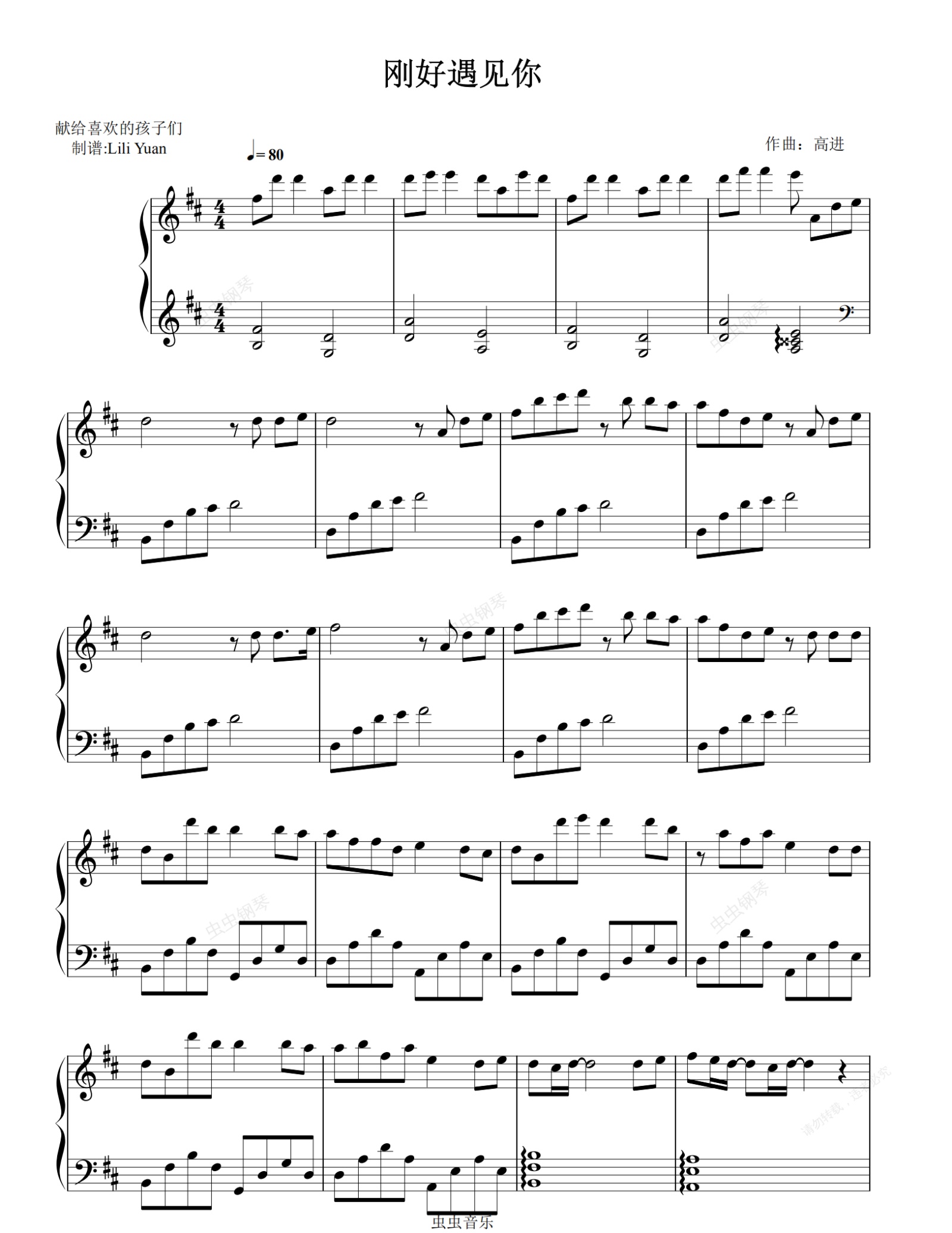 钢琴谱:刚好遇见你 D调(LY)