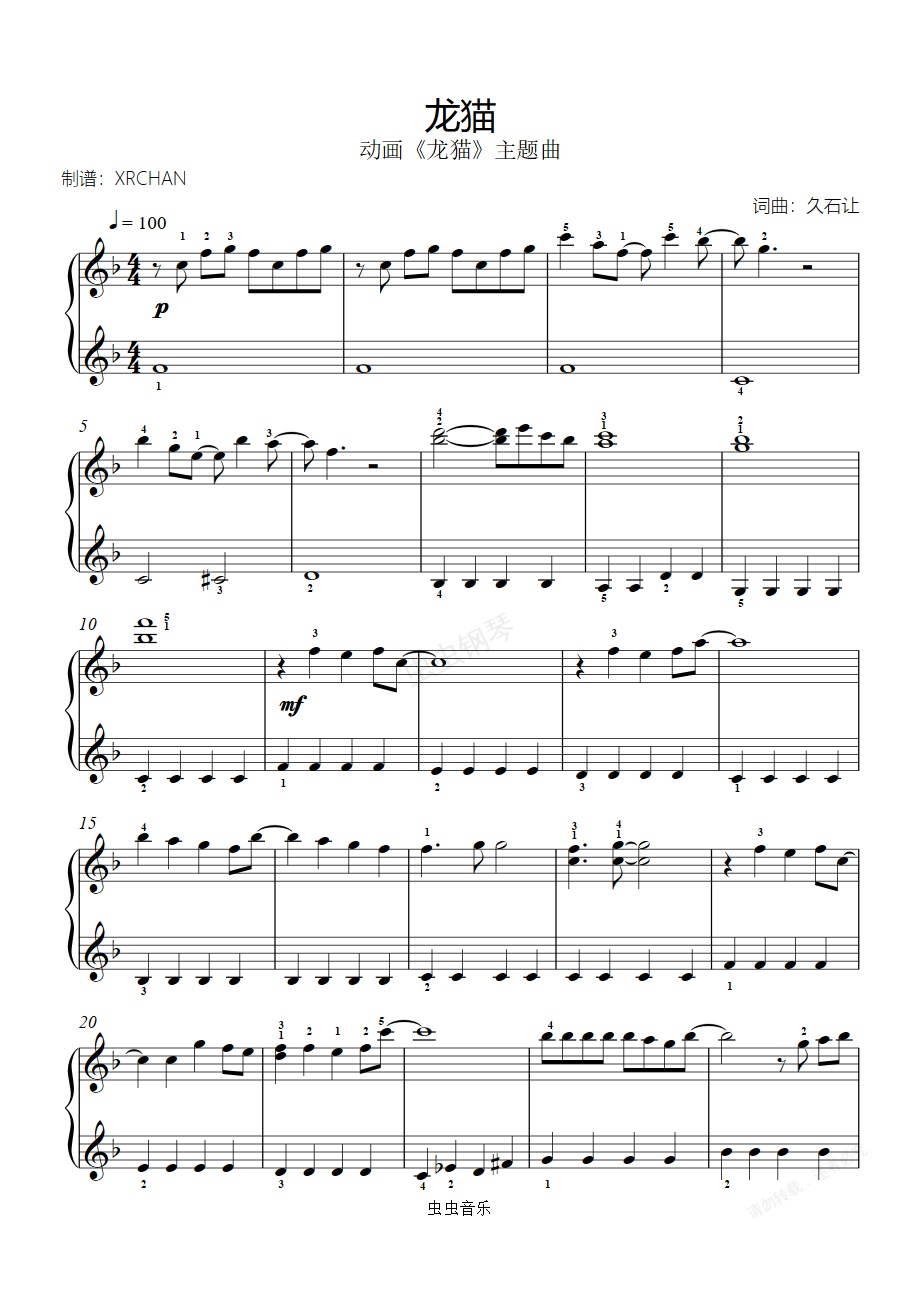 钢琴谱:《龙猫》带指法 超简单幼幼版