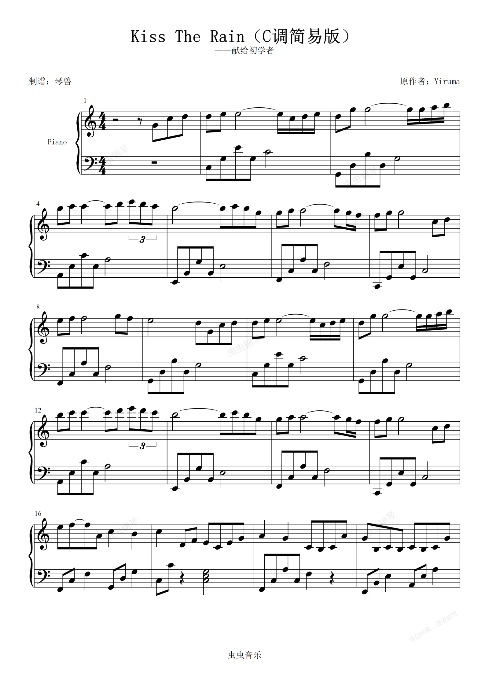钢琴谱:Kiss the rain 琴兽C调简单版