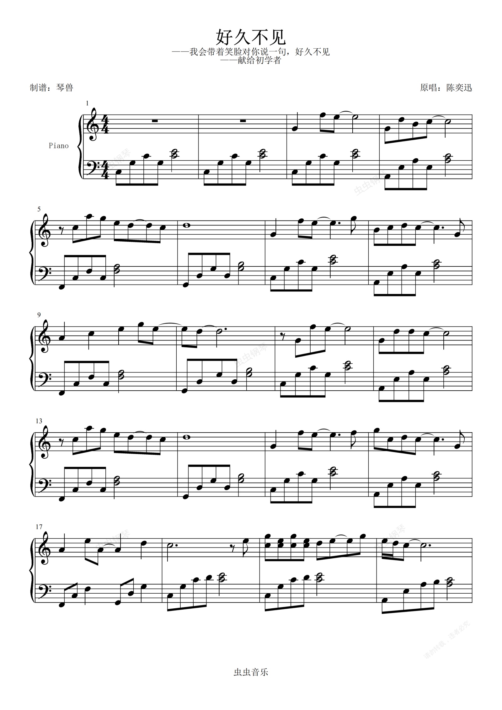 钢琴谱:好久不见-陈奕迅 琴兽C调简单版