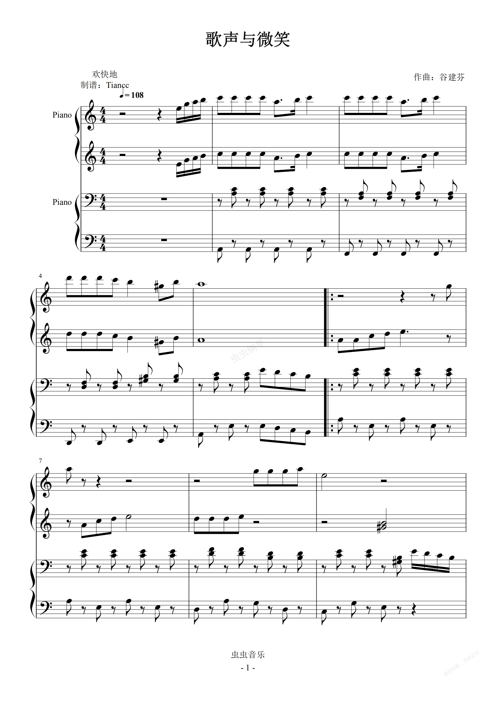 钢琴谱:《歌声与微笑》四手联弹谱---小汤3,拜厄难度
