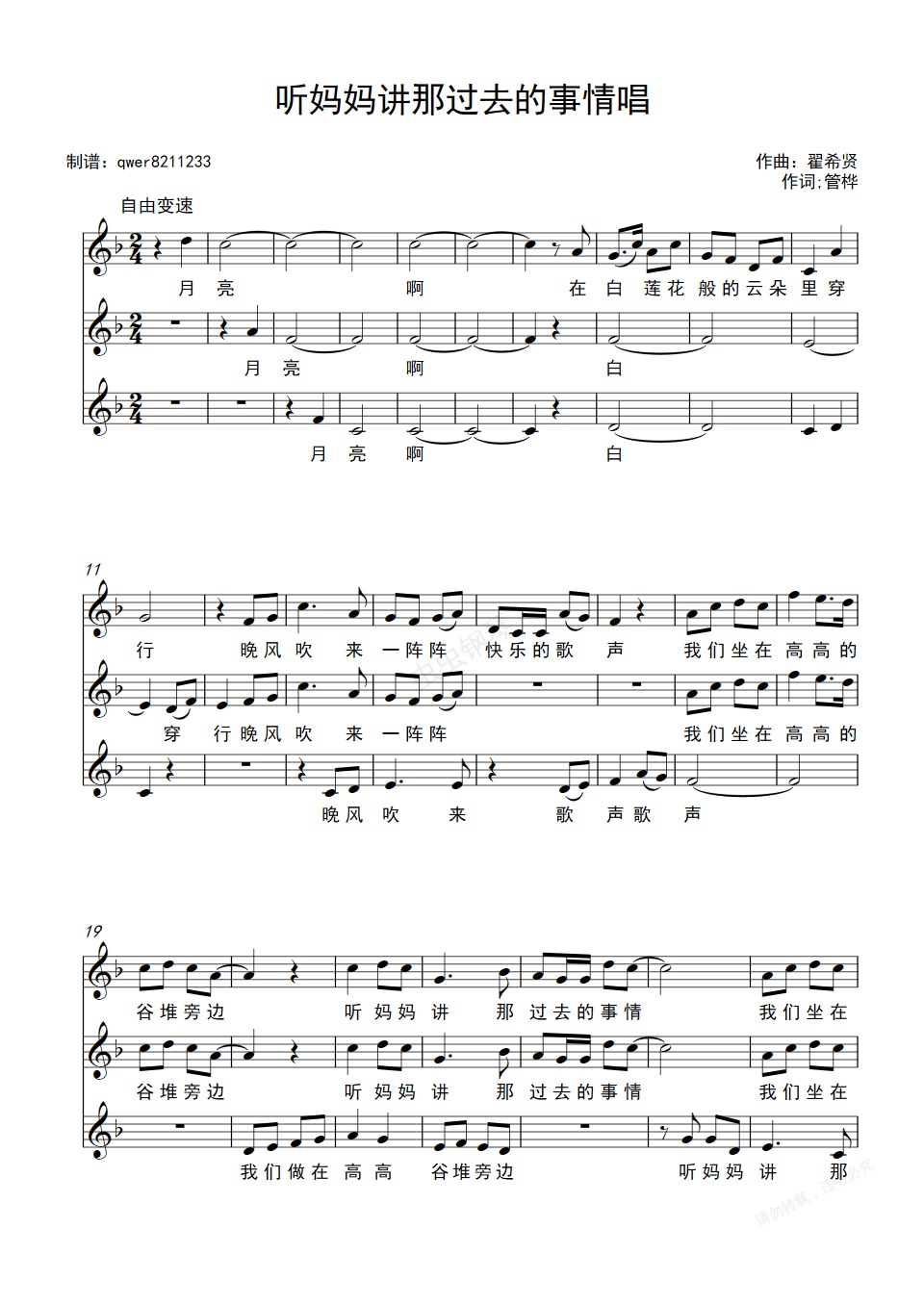 钢琴谱:听妈妈讲那过去的事情唱(合唱部分)