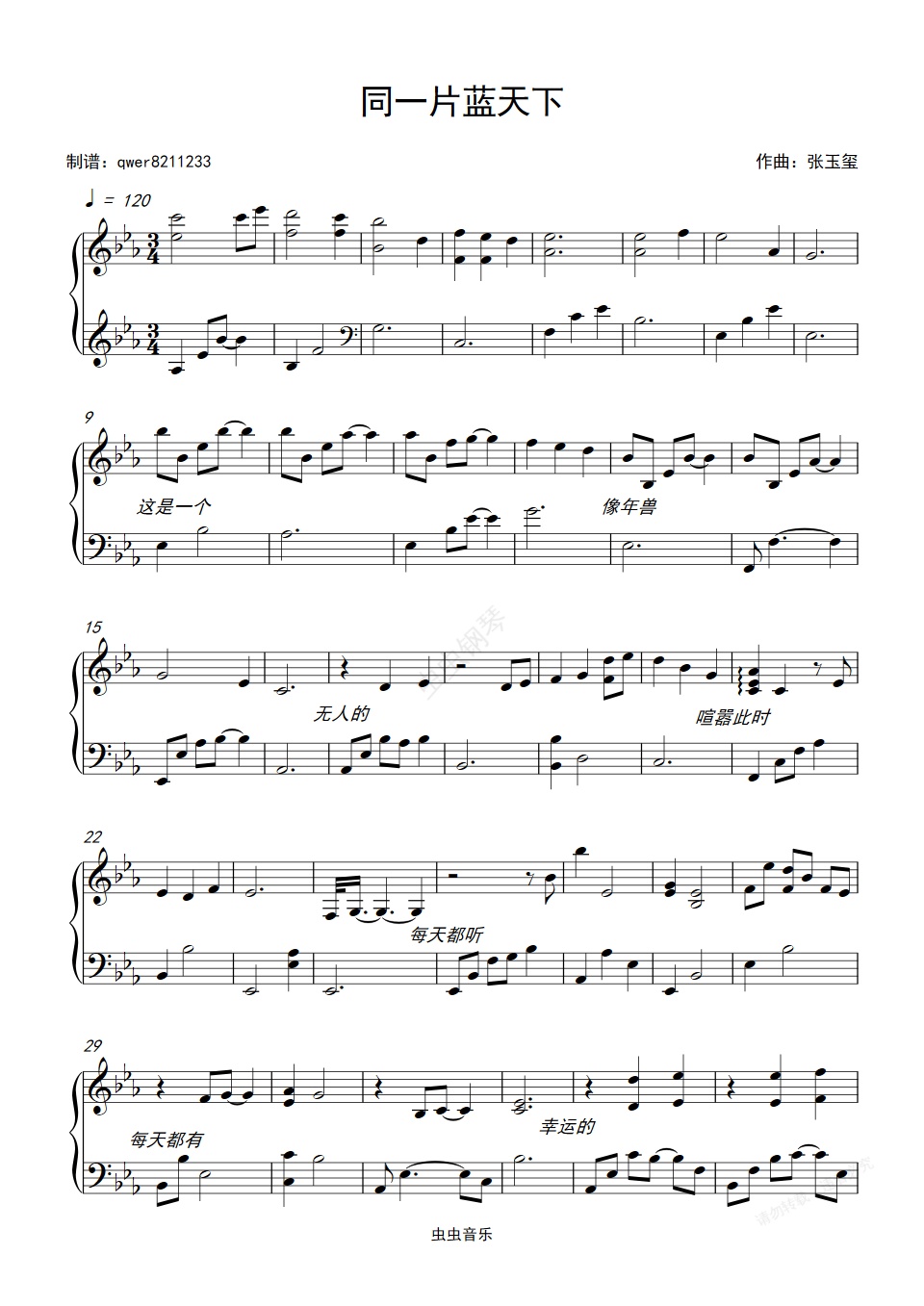 钢琴谱:同一片蓝天下