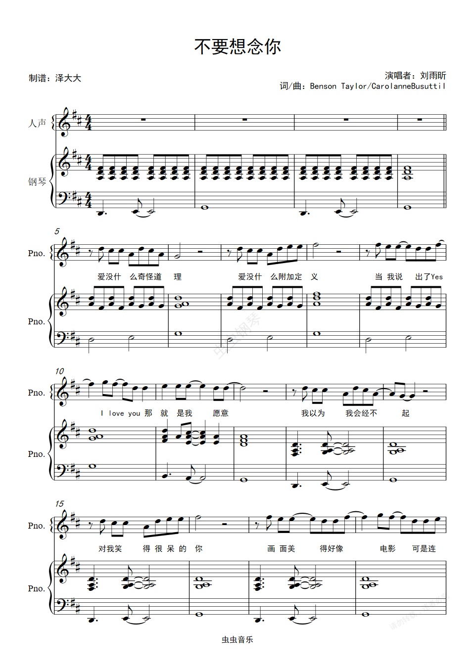 钢琴谱:不要想念你【完美伴奏附词】