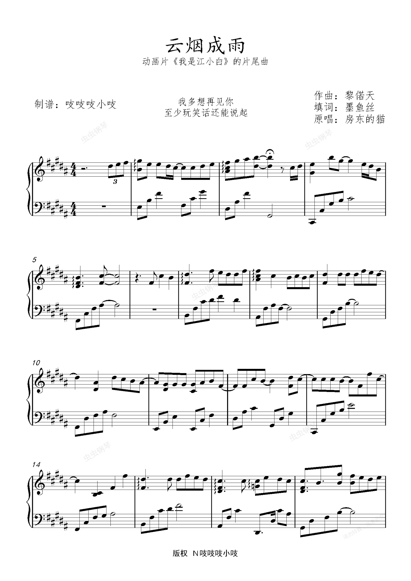 钢琴谱:云烟成雨 房东的猫 《我是江小白》片尾曲