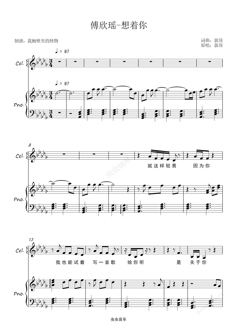 钢琴谱:弹唱谱 傅欣瑶-《想着你》【简易动听】中国好声音