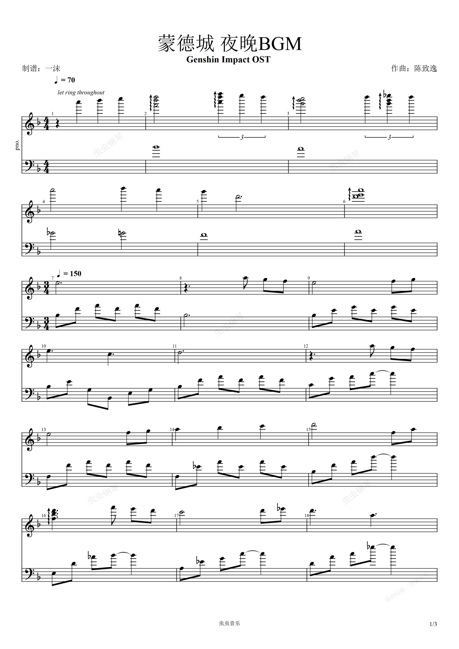 钢琴谱:原神-蒙德城 夜晚BGM 钢琴独奏