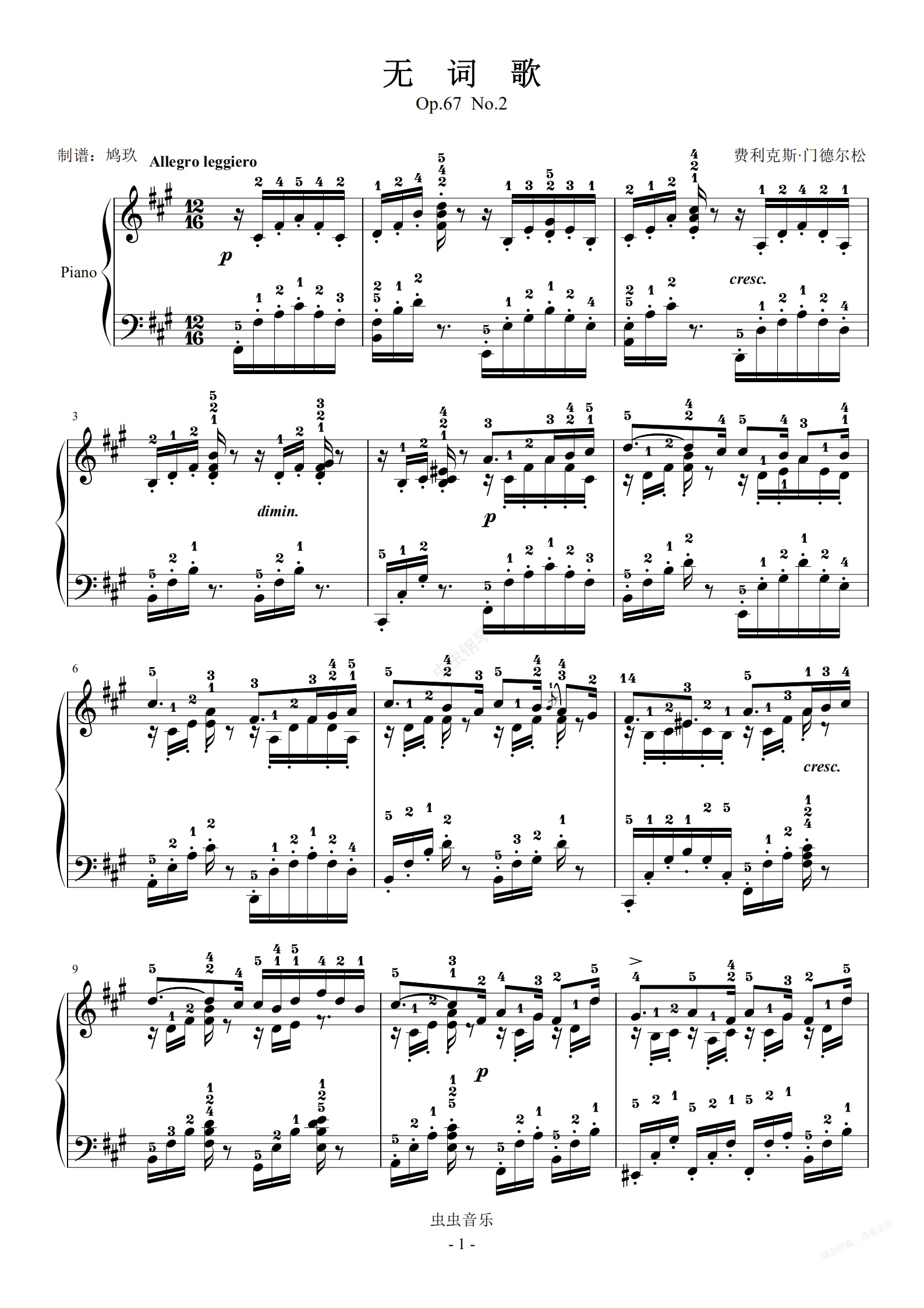 钢琴谱:门德尔松无词歌(Op67 No2)全指法