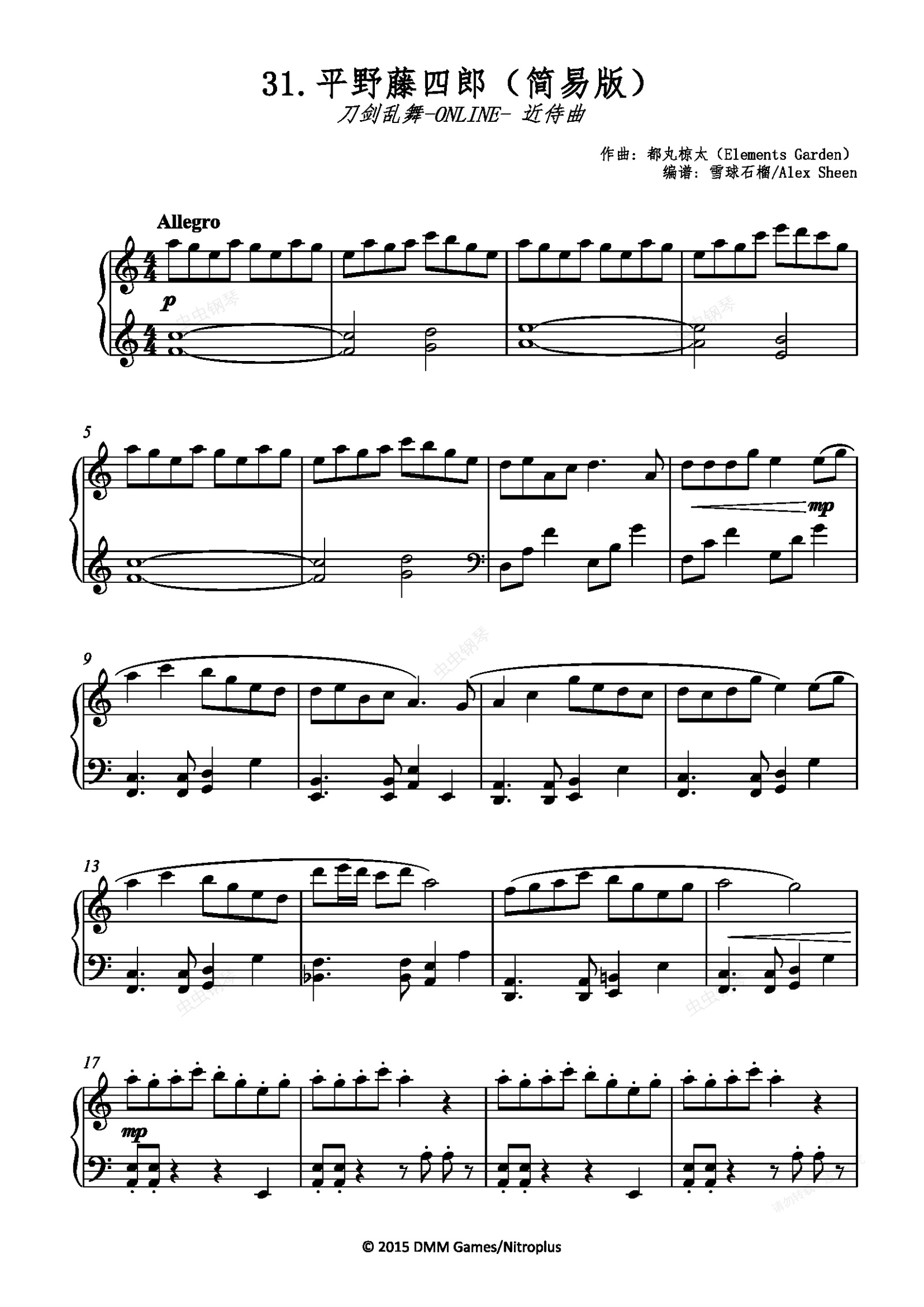 钢琴谱:平野藤四郎 近侍曲 【刀剑乱舞】(简易版)