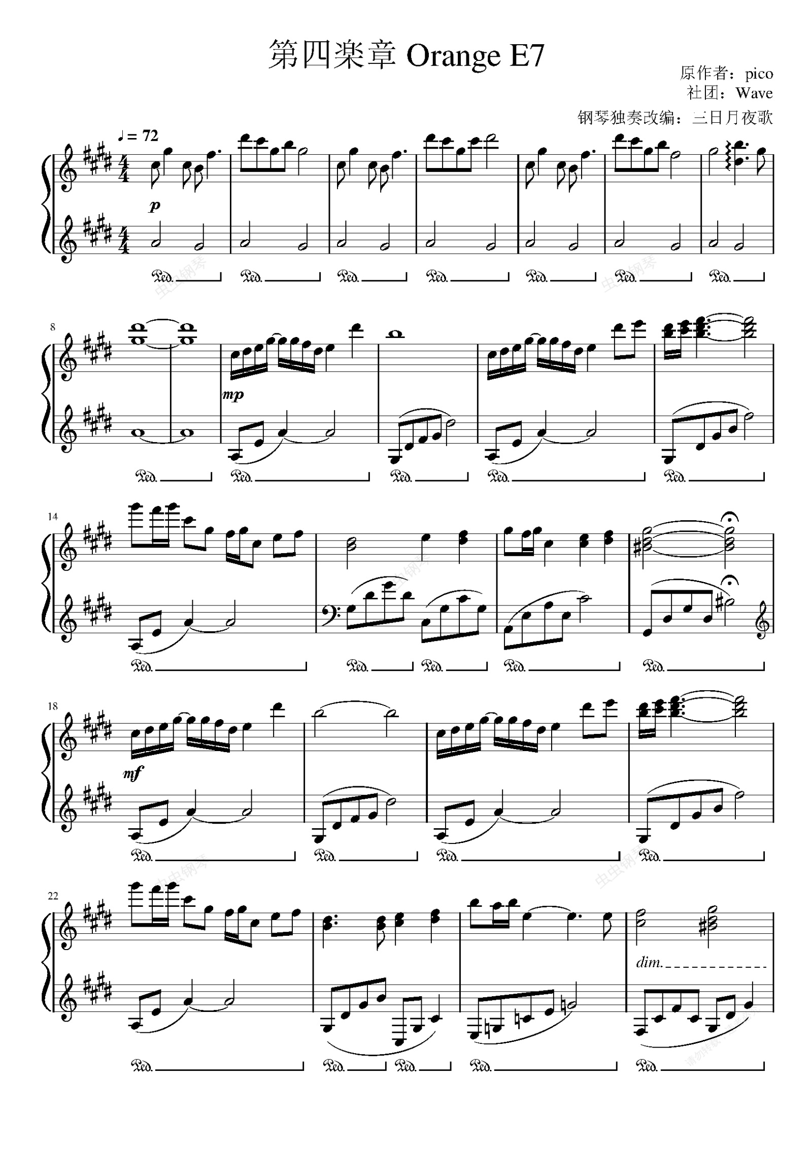 钢琴谱:【Wave】第四楽章 Orange E7(钢琴独奏改编)