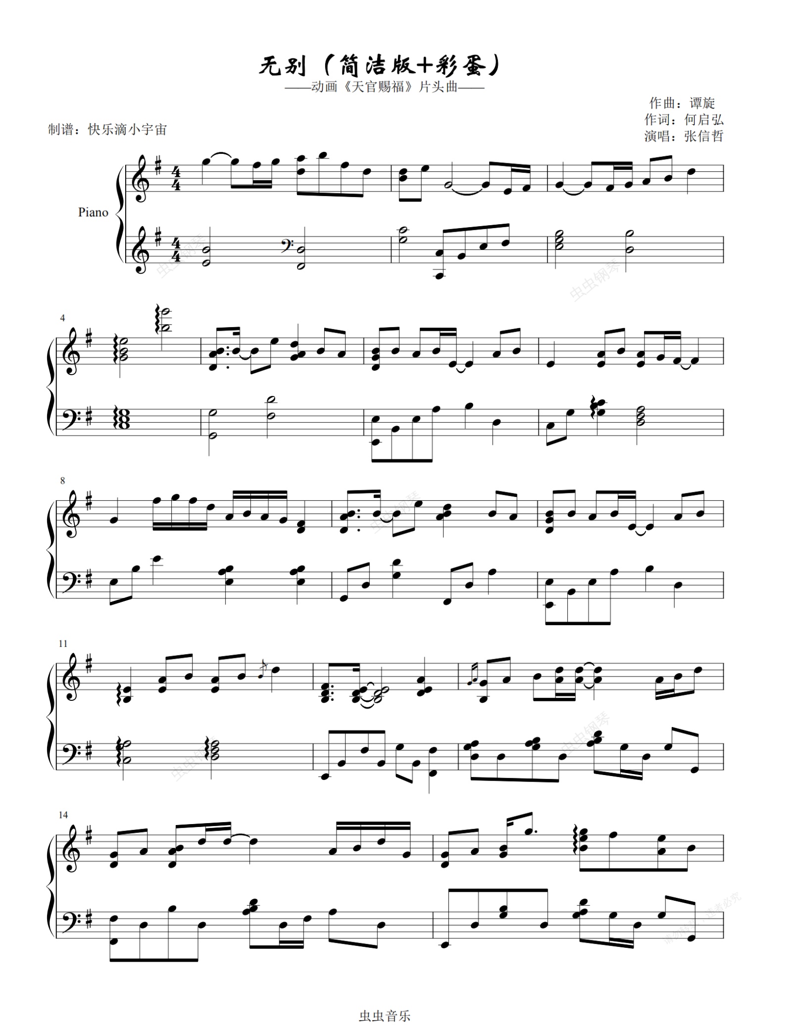 钢琴谱:无别(简洁+彩蛋版)——张信哲(动画片《天官赐福》片头曲)
