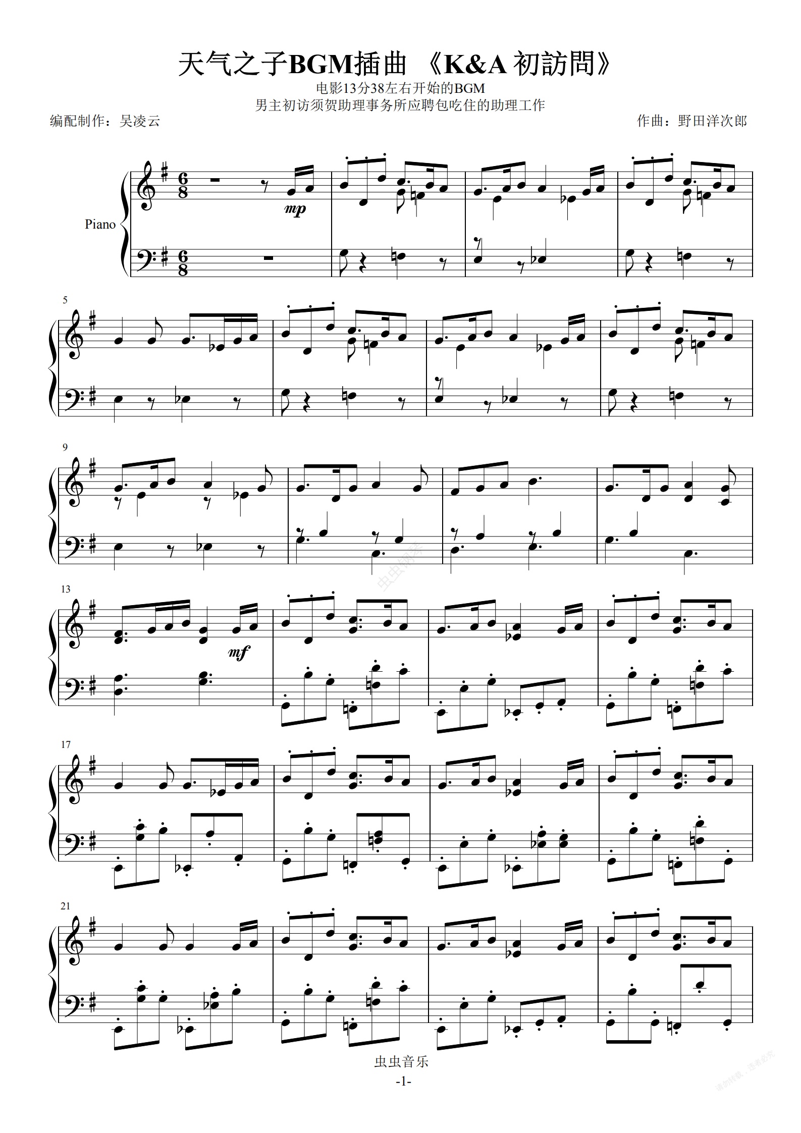 钢琴谱:天气之子BGM插曲 K&A 初訪問(第一次访问K&A )天気の子 吴凌云制作钢琴版