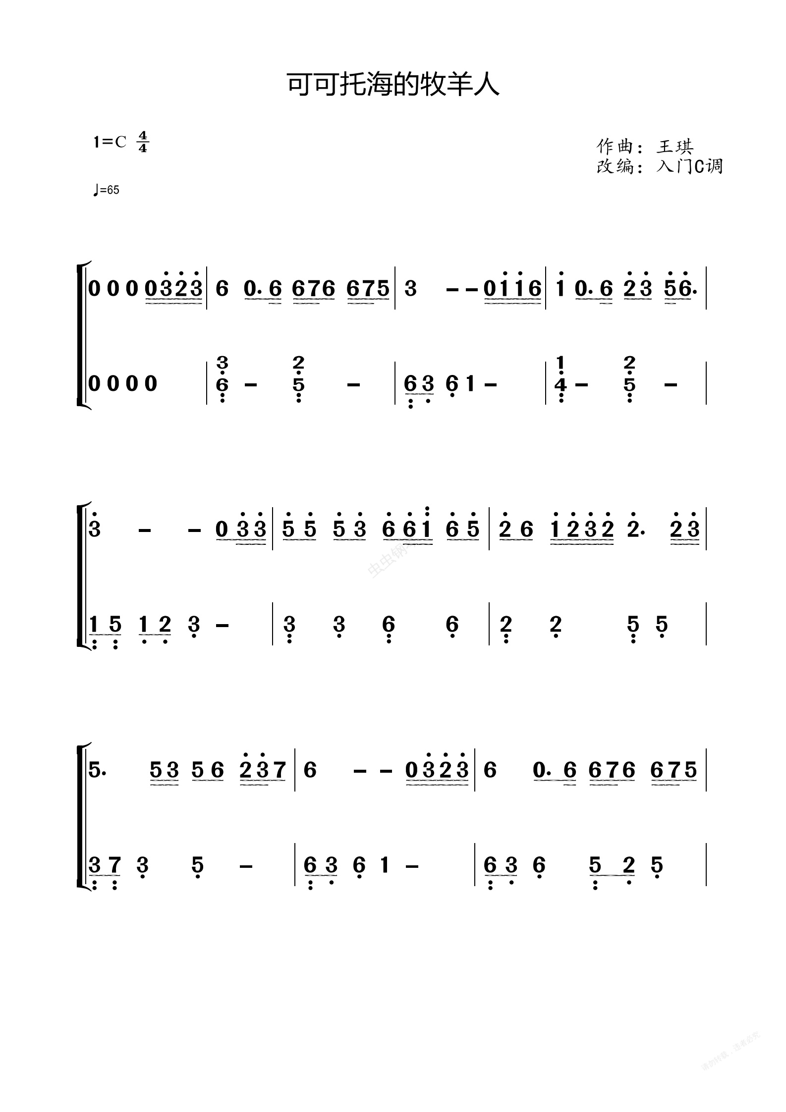 钢琴谱:王琪《可可托海的牧羊人》入门C调简谱