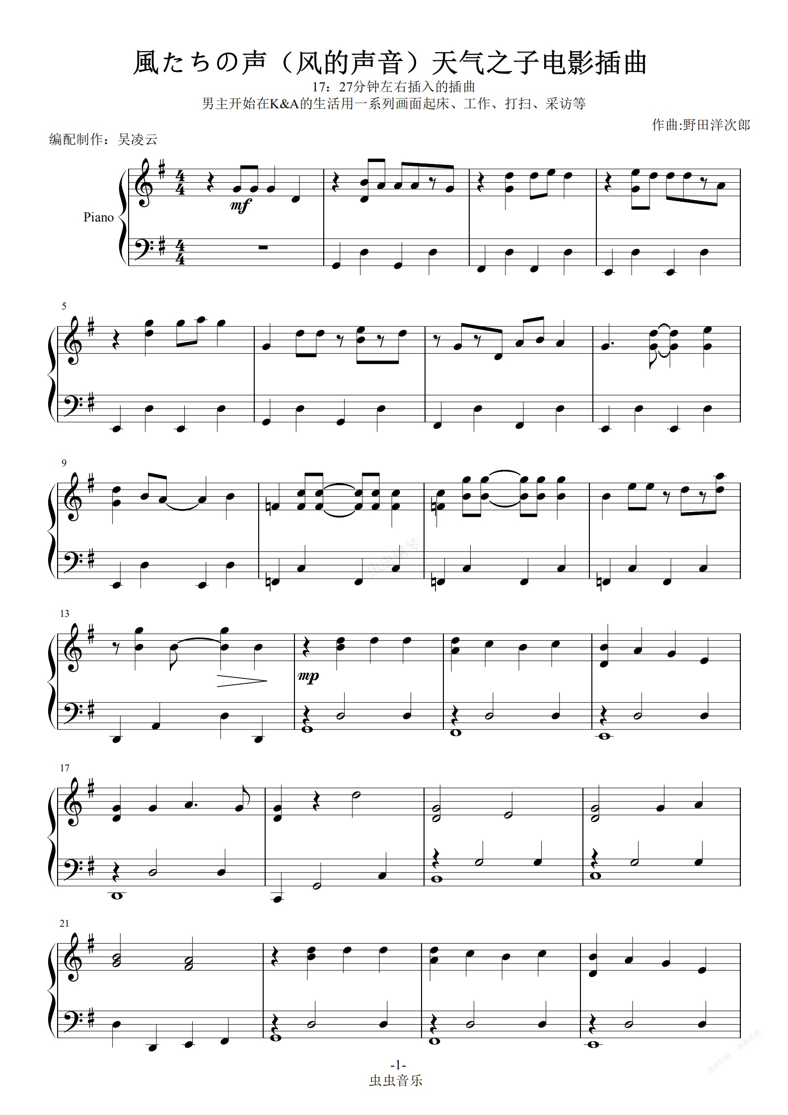 钢琴谱:天气之子BGM插曲 風たちの声(风的声音)天気の子 吴凌云制作钢琴版