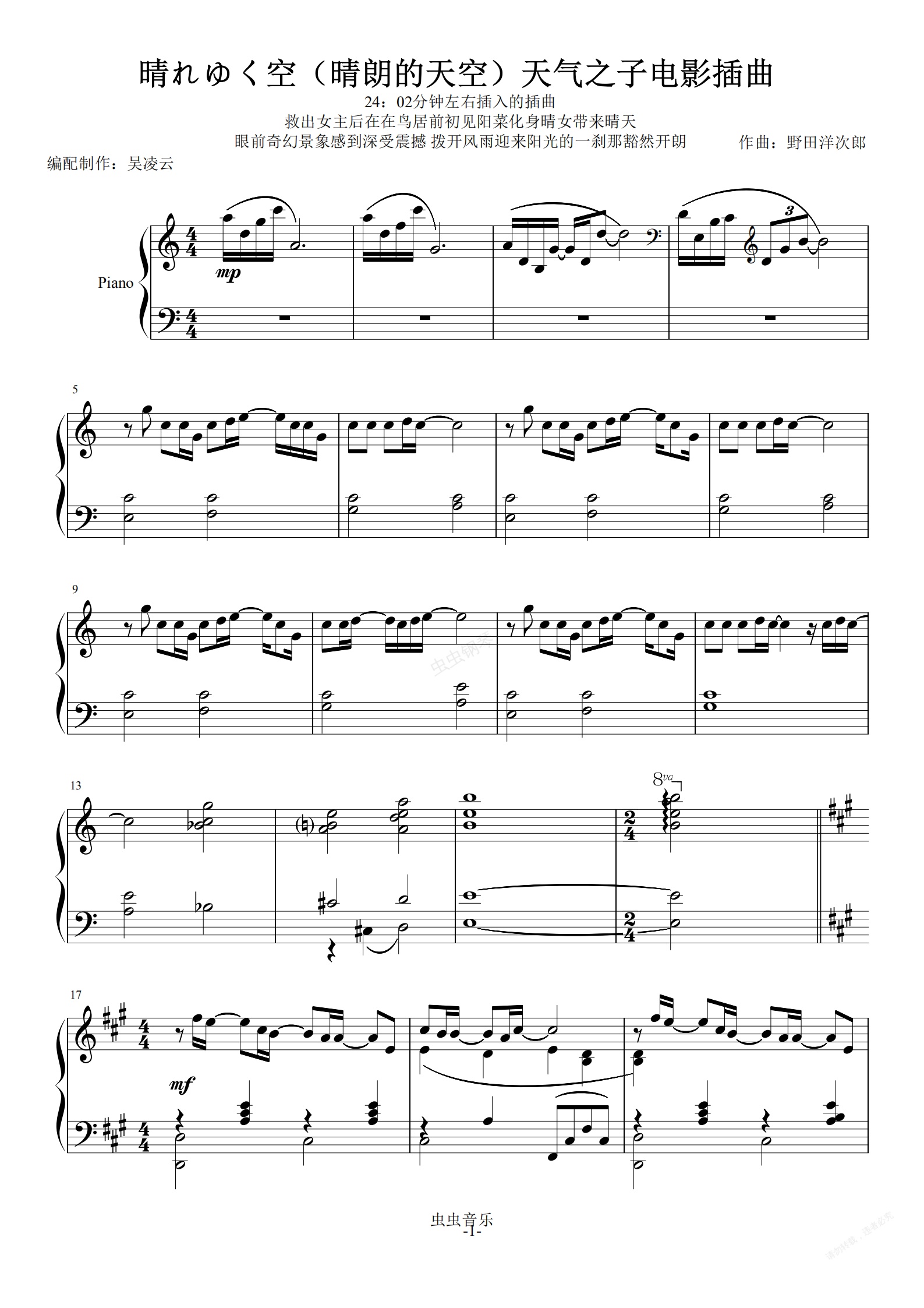 钢琴谱:天气之子BGM插曲 晴れゆく空(晴朗的天空)天気の子 吴凌云制作钢琴版