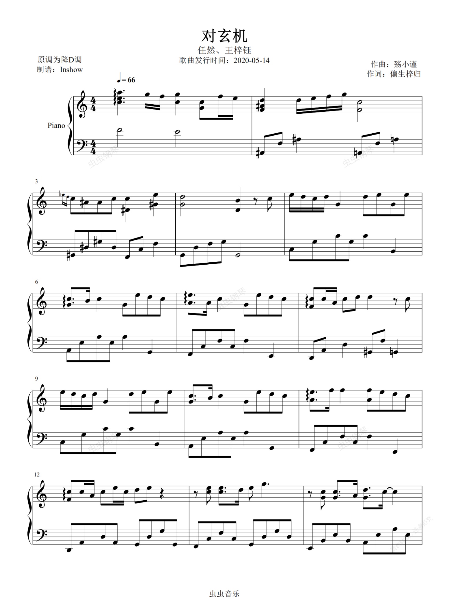 钢琴谱:对玄机【C调独奏】- 任然、王梓钰