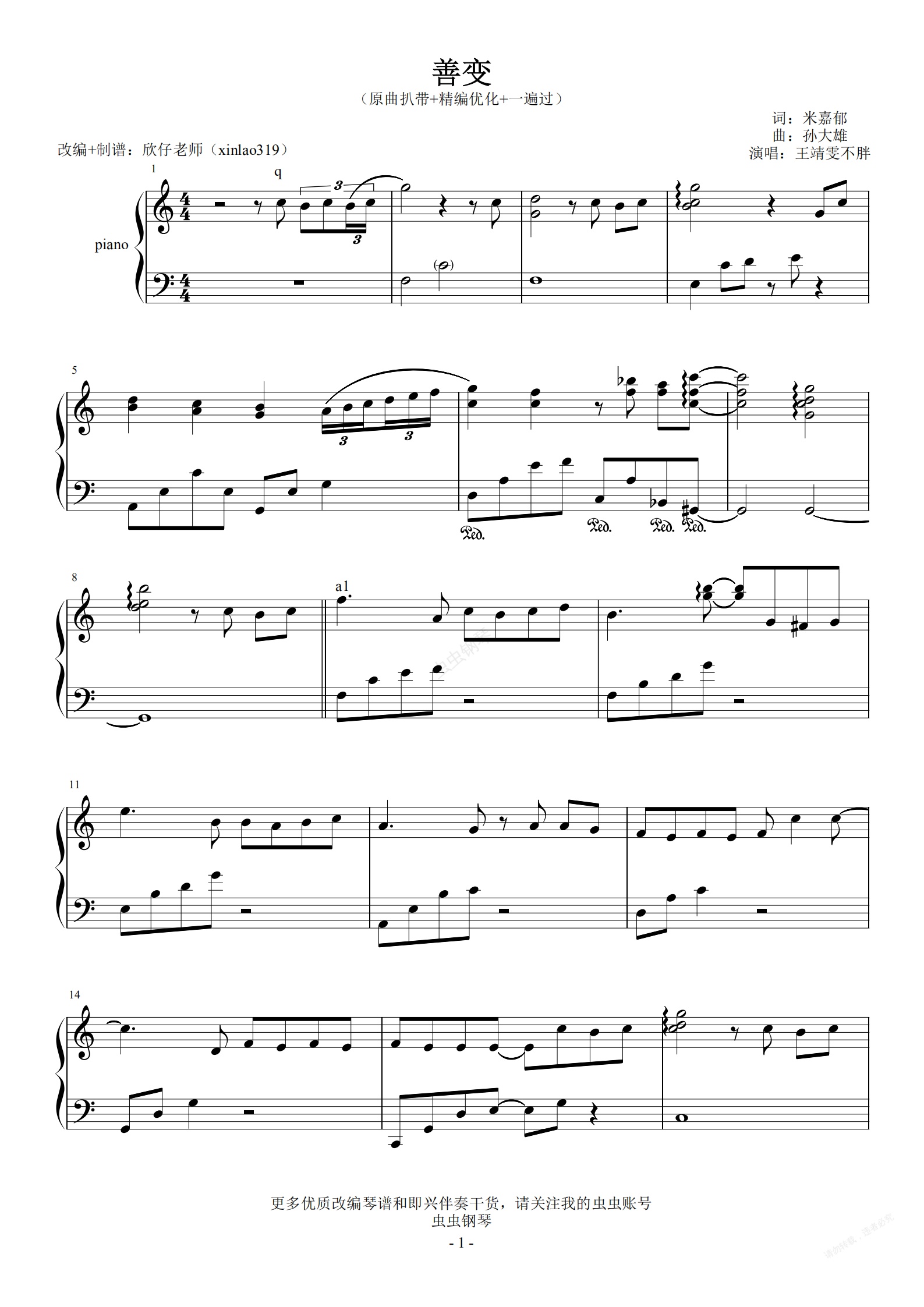 钢琴谱:善变——C调(全新精编+一遍过)