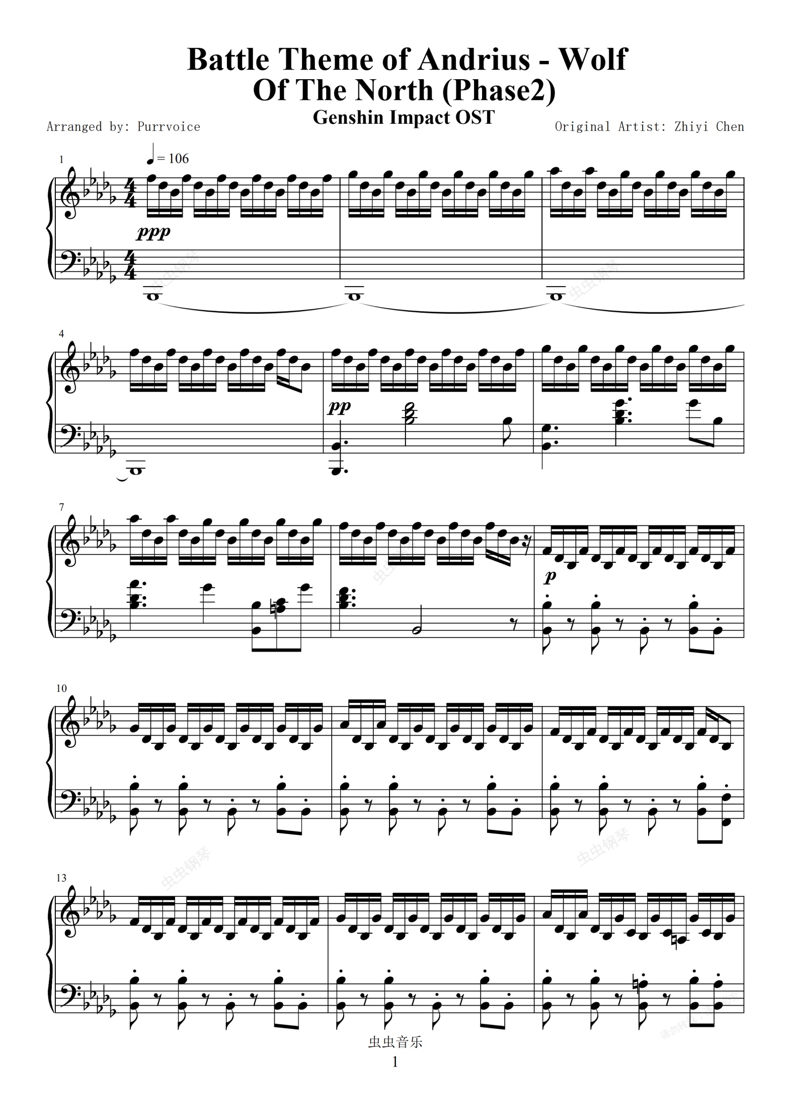这次的谱面显而易见的比璃月的战斗BGM简单。这首曲子是原神BOSS北风狼安德留斯的战斗背景音乐(第二形态)原曲前半段左右手交替处理多声部,对大跳有要求,1分23秒的高速琶音配合管弦乐非常好听!2分32秒的织体参考了肖邦第一叙事曲。2分40秒以后的那段比较安静的原曲部分我特别喜欢,尤其是时钟的滴答声。3分49秒我遇到的困难在于用钢琴还原出此处的氛围。除此之外还对踏板的处理细节有一定的要求,总的来说不是特别难的一首曲子。