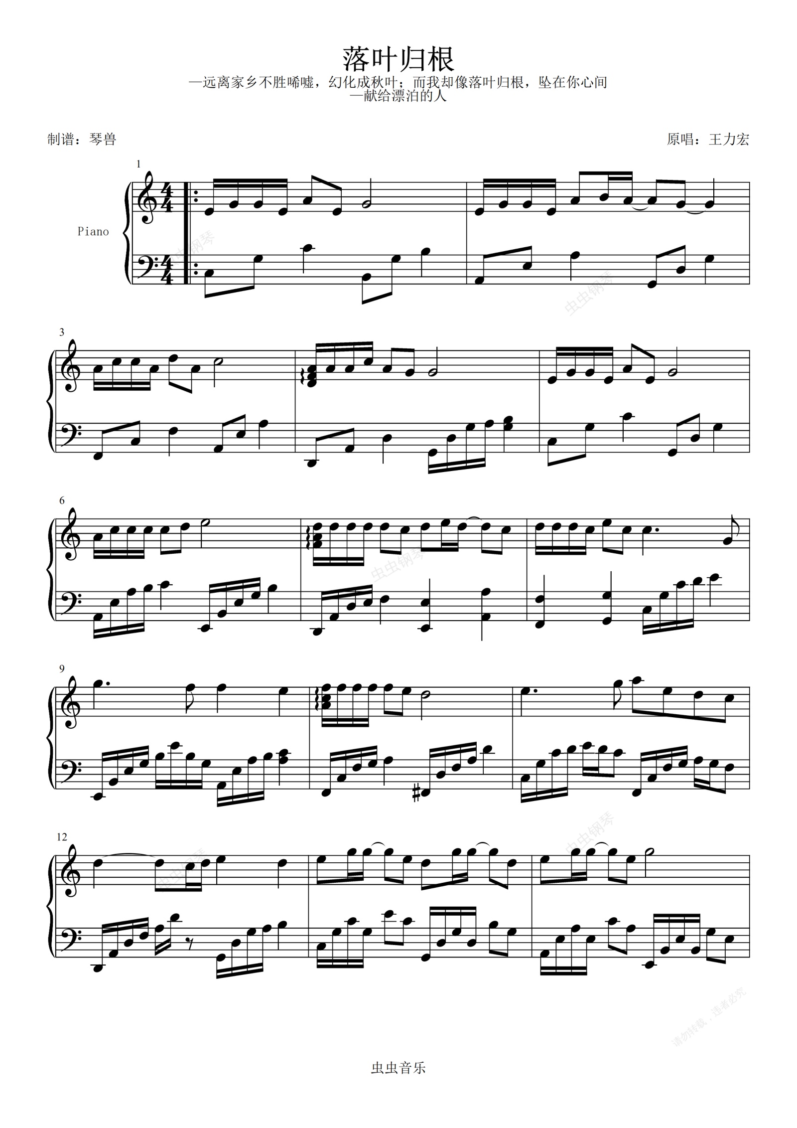 钢琴谱:落叶归根-王力宏 琴兽版