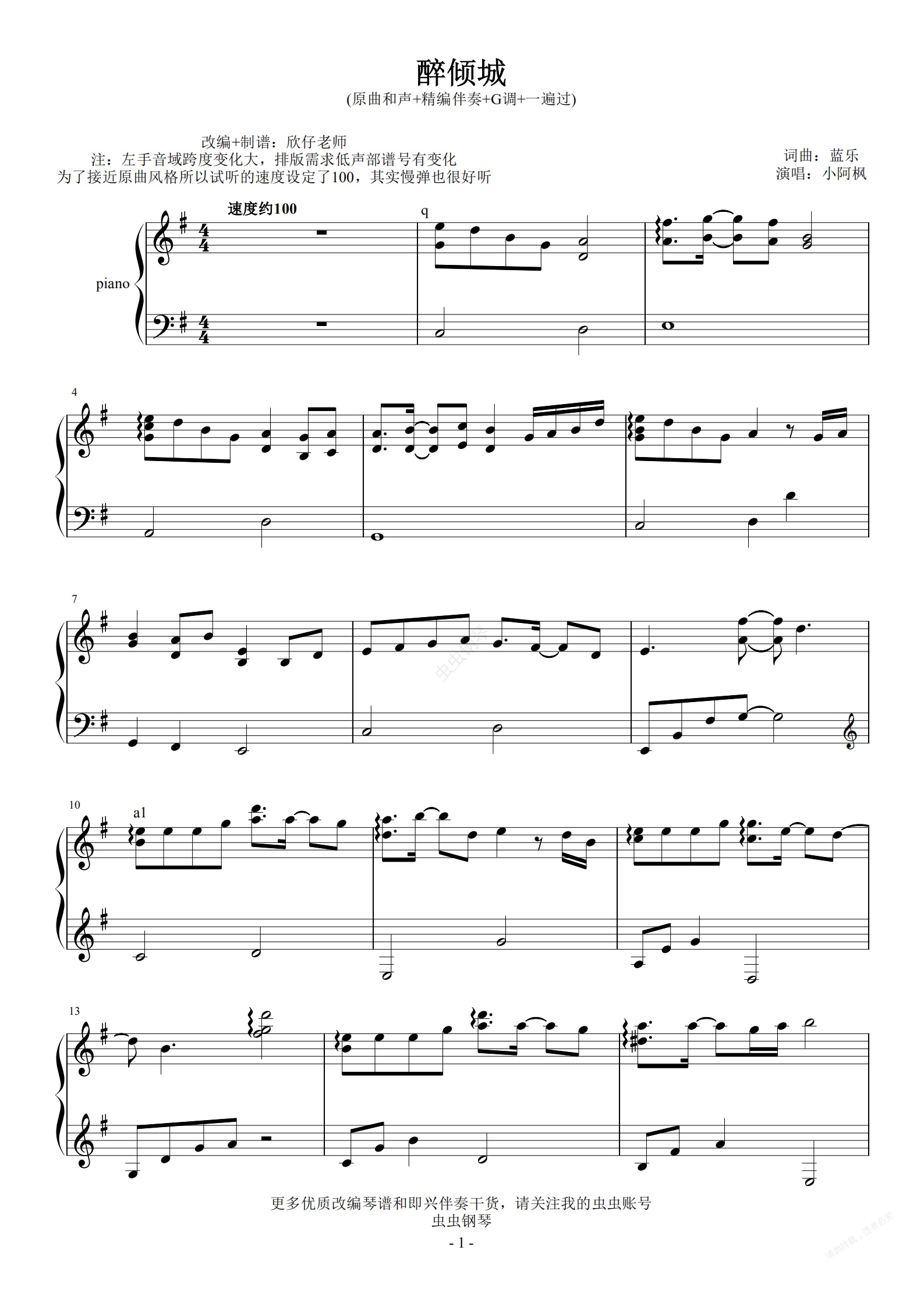 钢琴谱:醉倾城-G调(原曲和声+精编伴奏+一遍过)