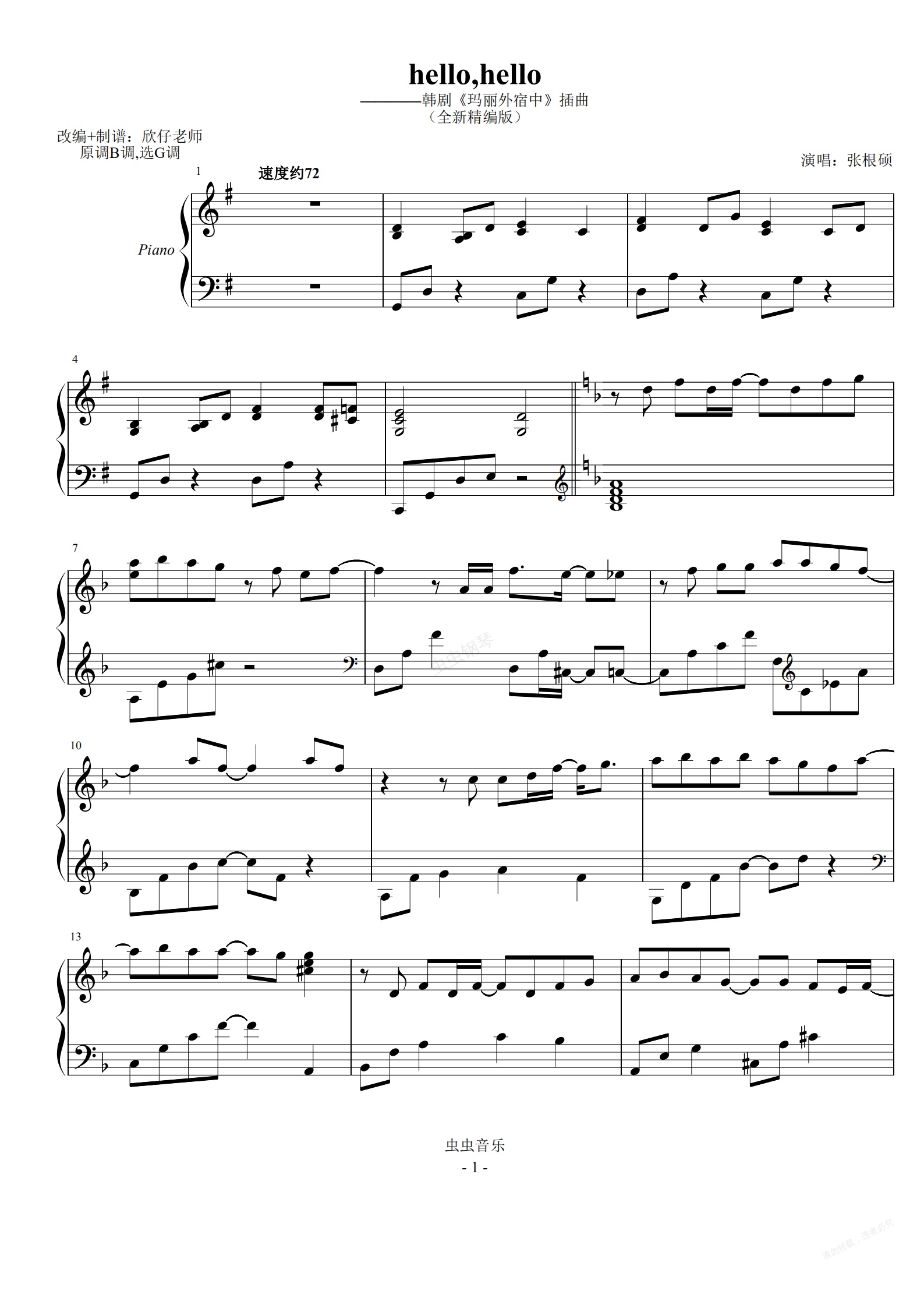 钢琴谱:hello hello-F转G调(韩剧《玛丽外宿中》原声带的背景音乐版)