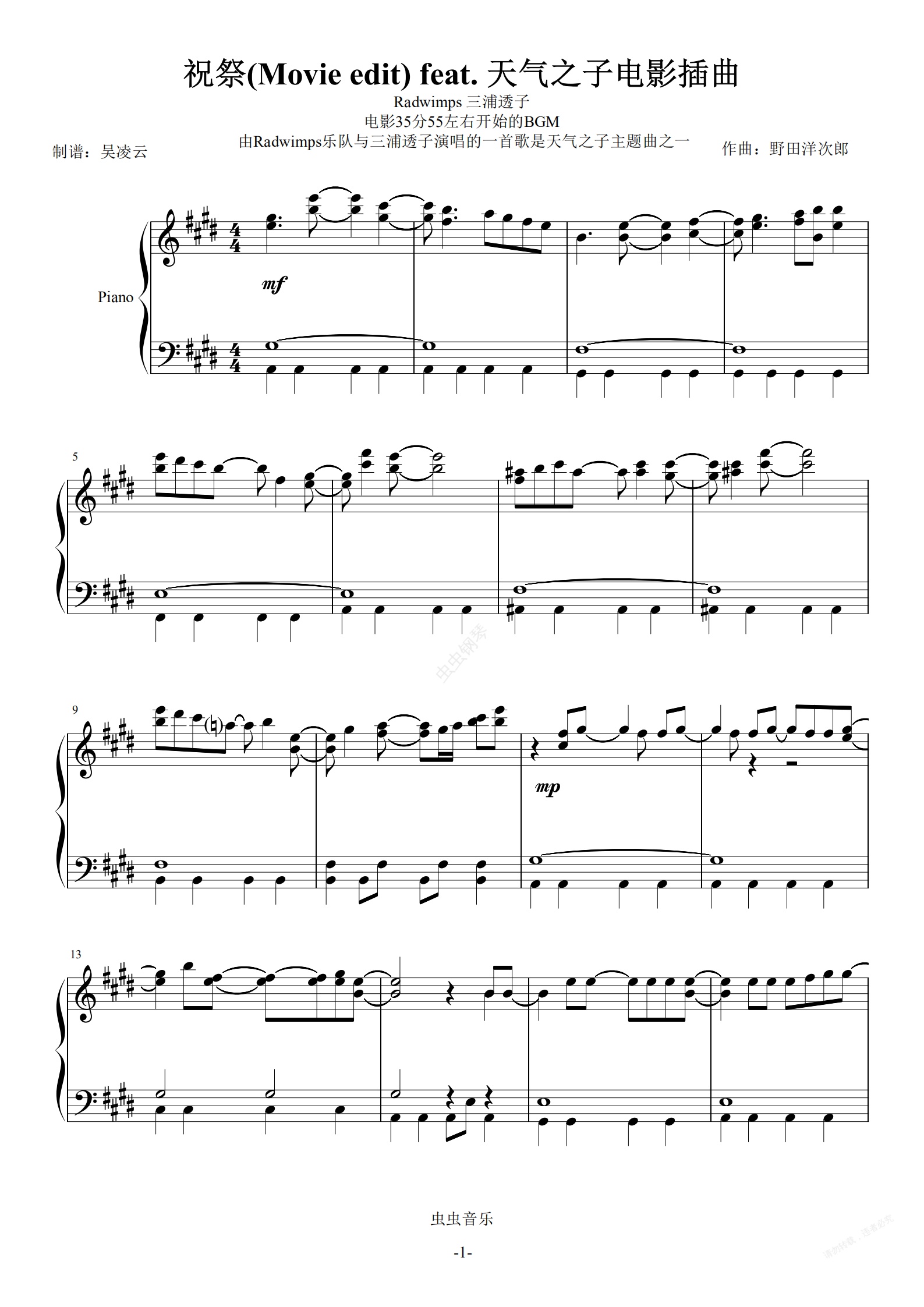 钢琴谱:天气之子主题曲 祝祭(Movie edit) feat.三浦透子 天気の子BGM插曲 吴凌云制作钢琴版