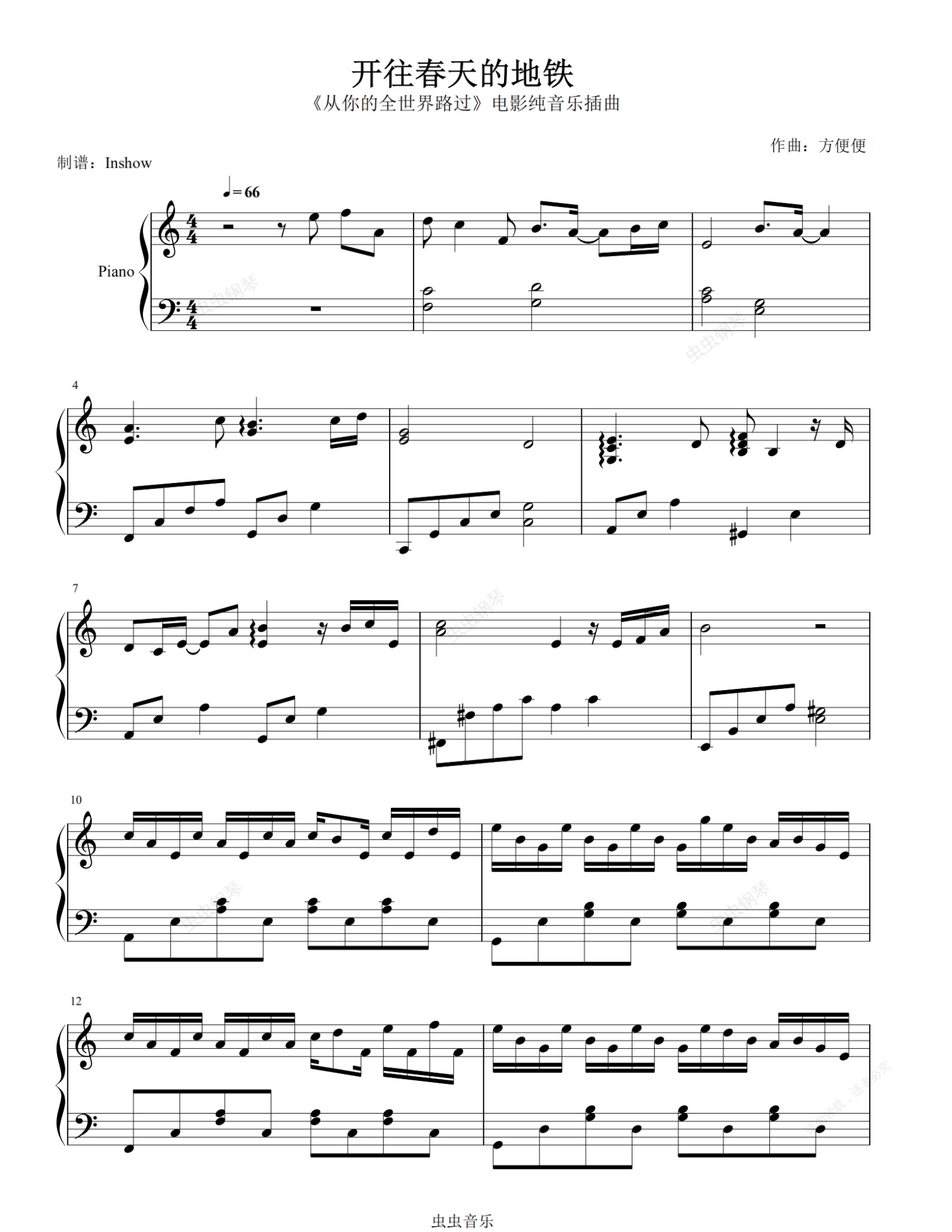 钢琴谱:开往春天的地铁【独奏】(《从你的全世界路过》电影纯音乐插曲)
