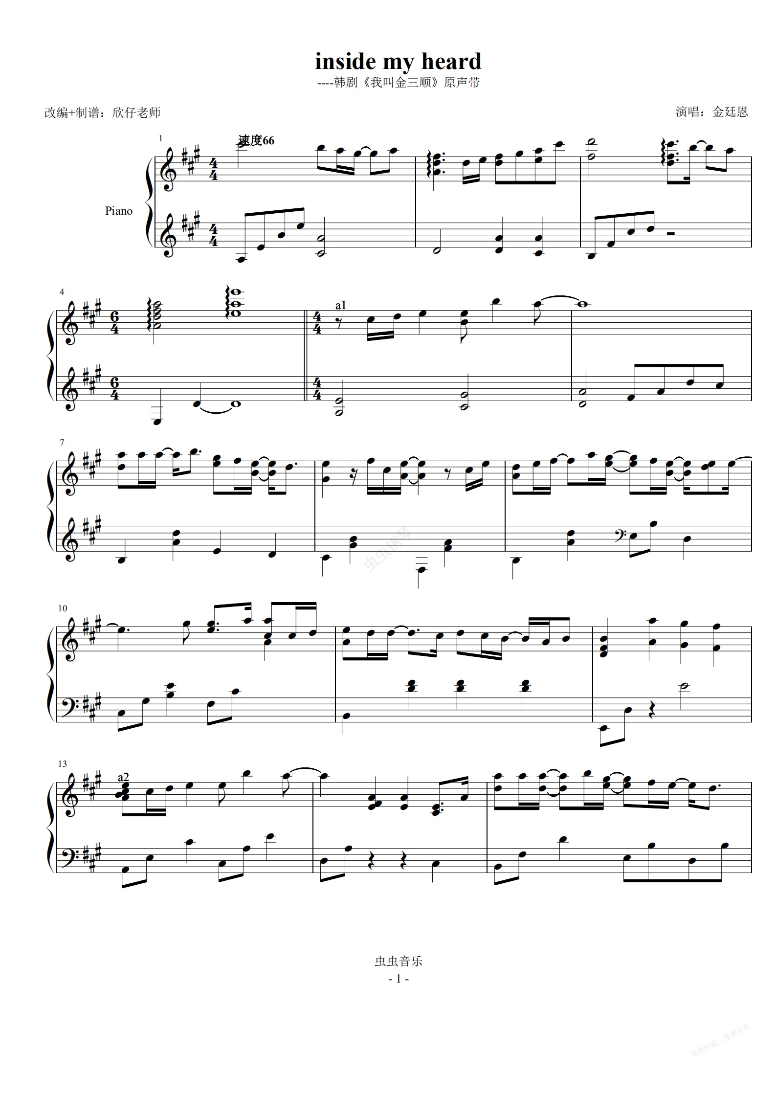 钢琴谱:A-Inside my heart(《我叫金三顺》原声带)