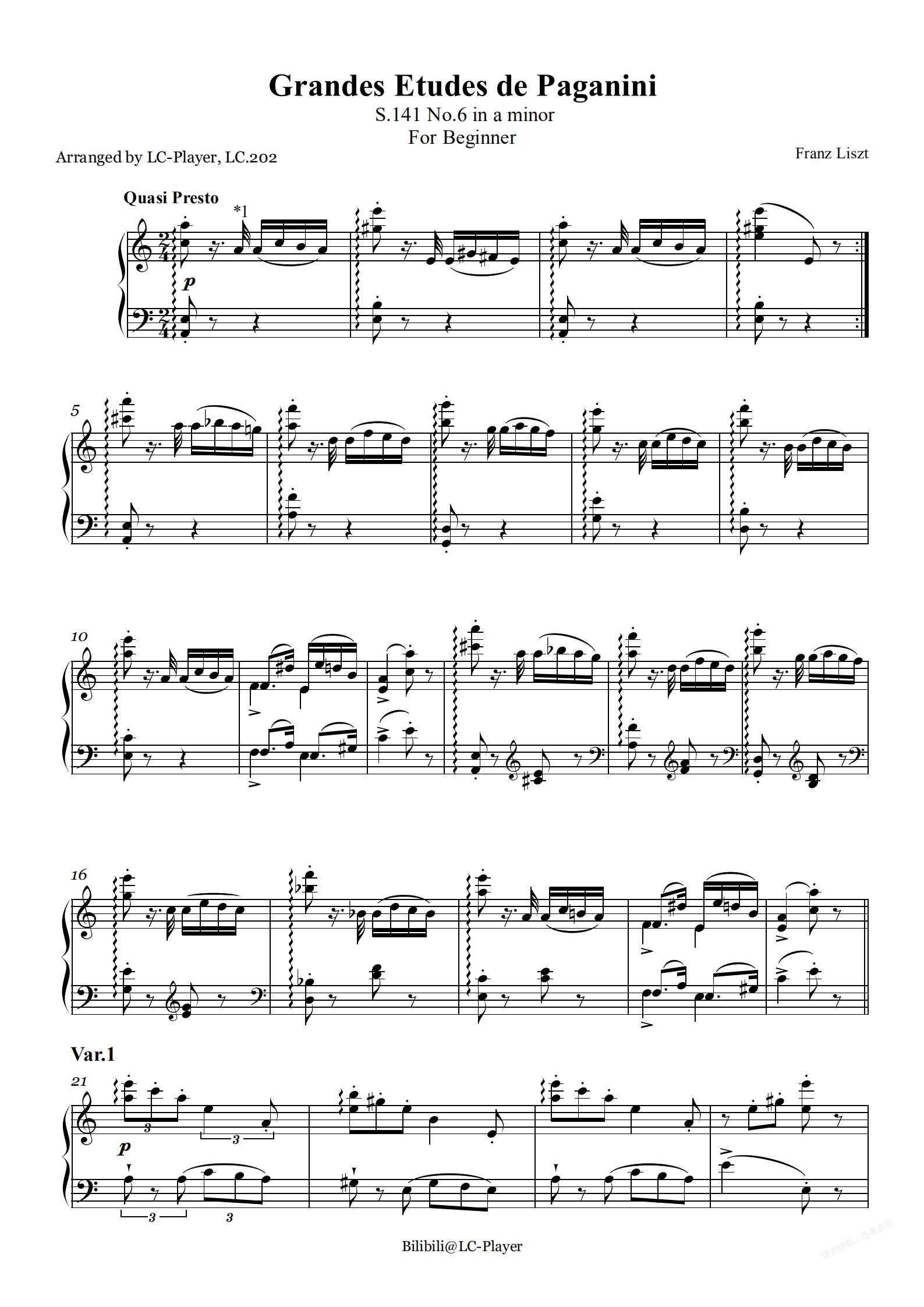 钢琴谱:【初学者】帕格尼尼大练习曲 第6首 a小调 李斯特(Grandes Etudes de Paganini S.141 No.6 Liszt)简化