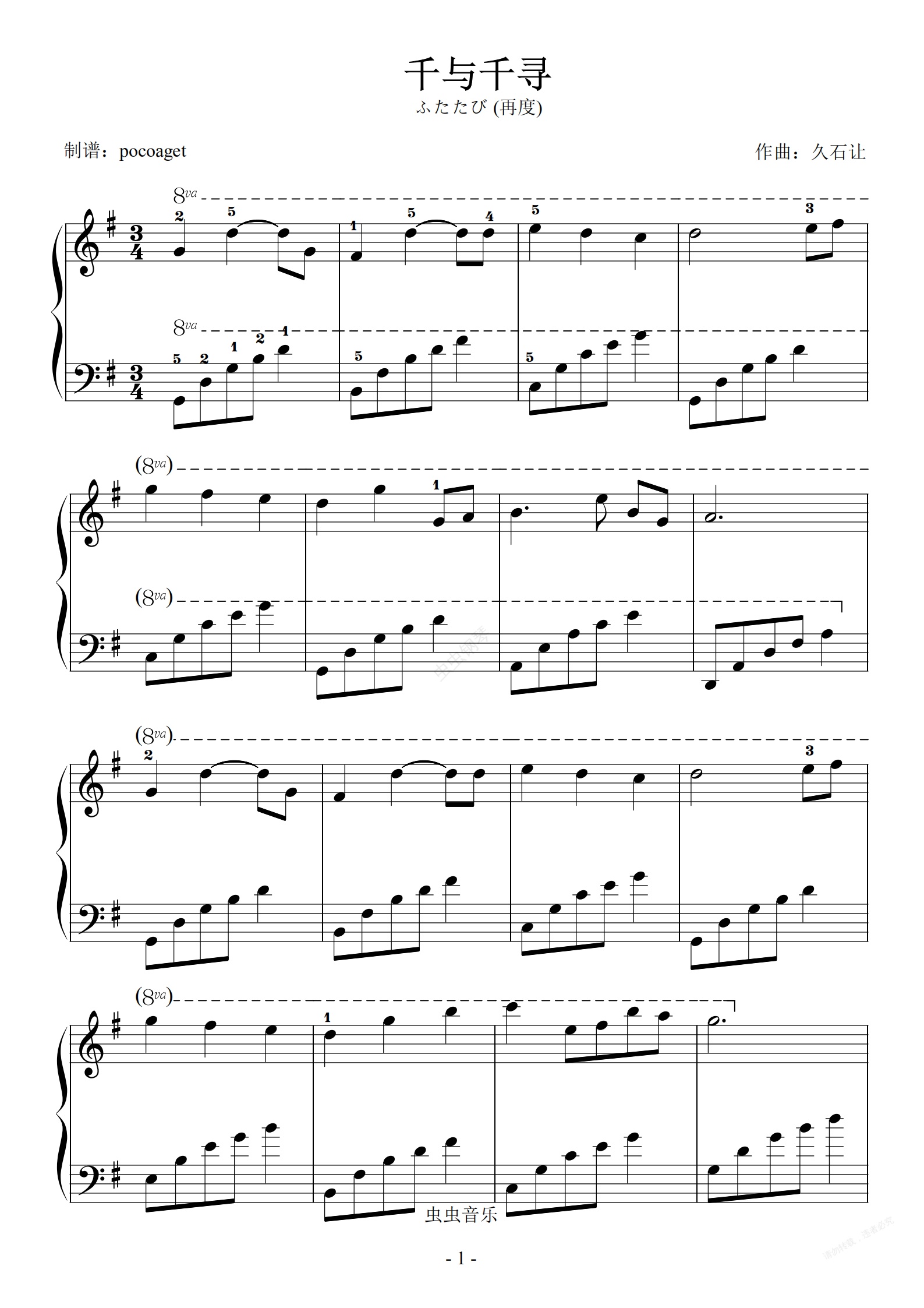 钢琴谱:《千与千寻再度》初学者G调(poc编配)