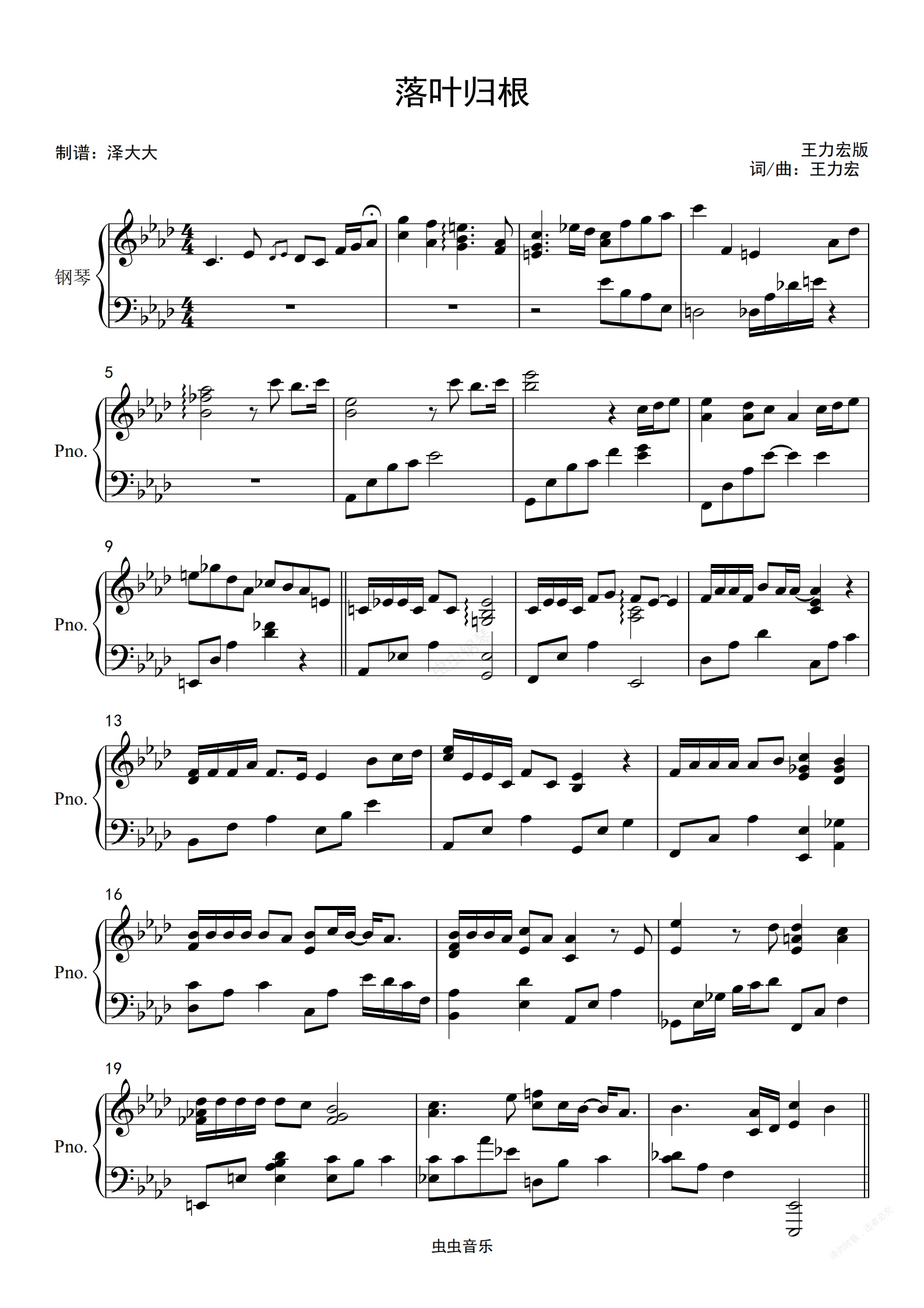 钢琴谱:落叶归根【完美独奏版】