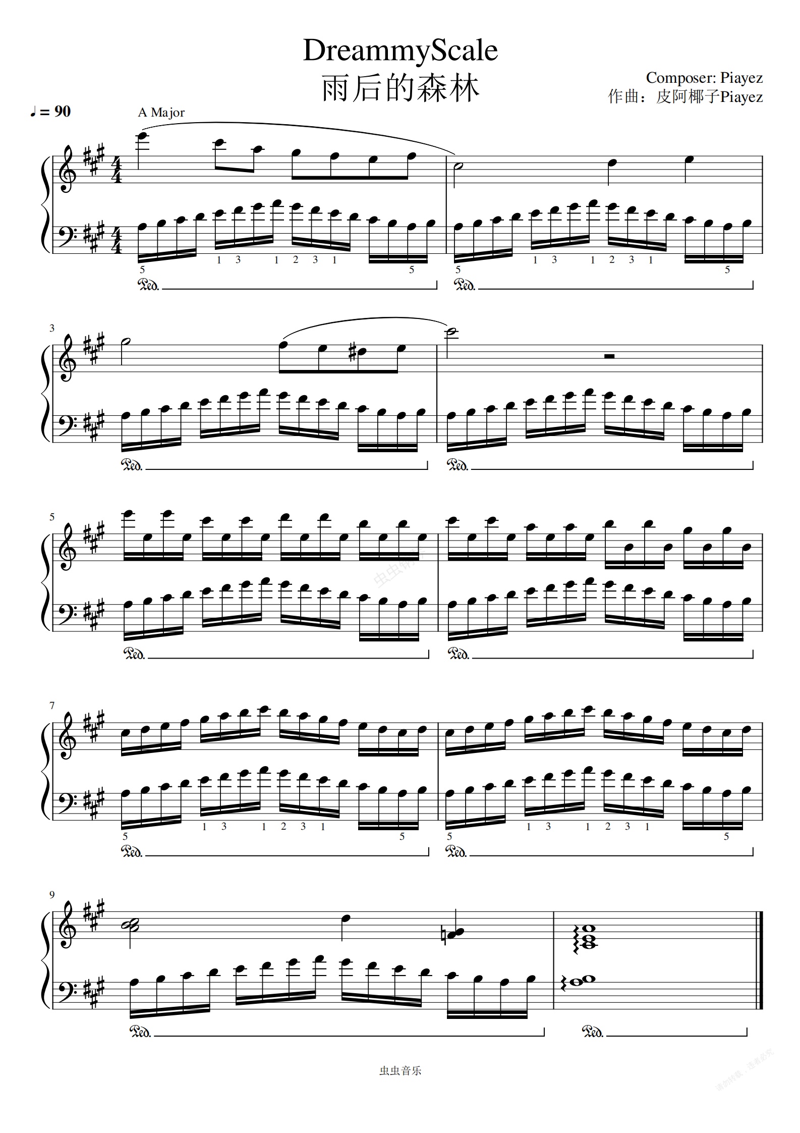 钢琴谱:开心梦幻练音阶—左手A大调「带指法」《雨后的森林》