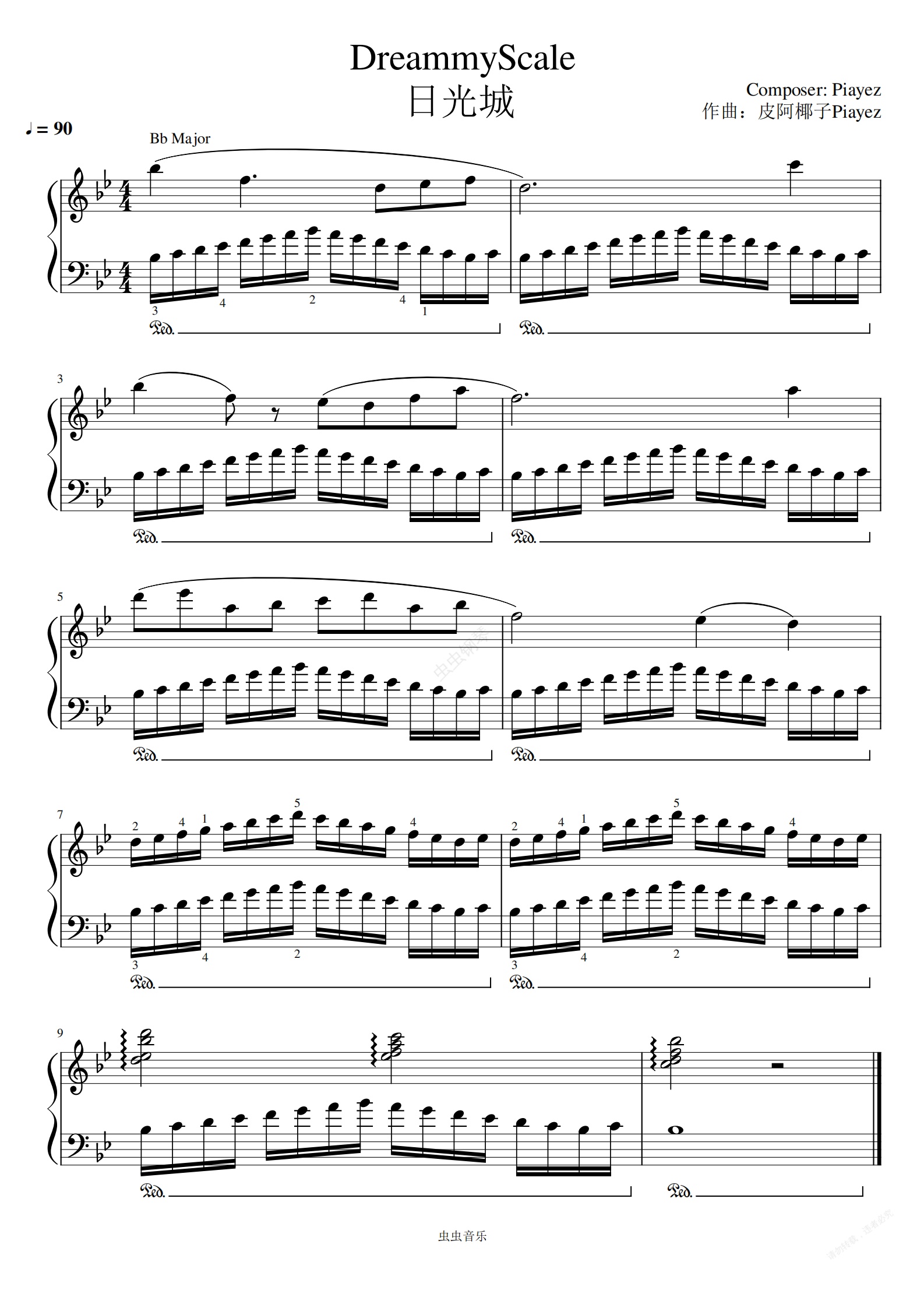 钢琴谱:开心梦幻练音阶—左手Bb大调「带指法」《日光城》