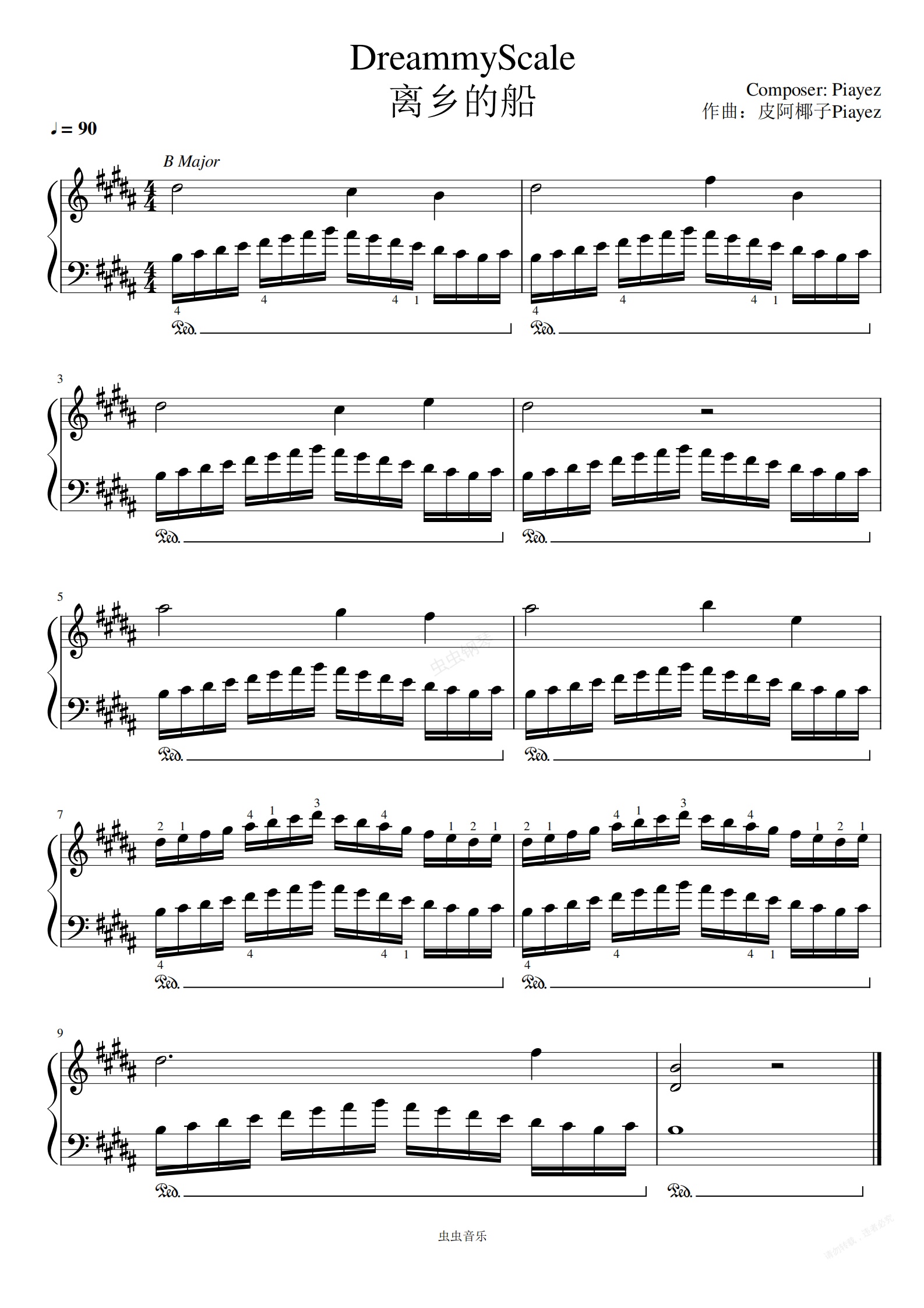 钢琴谱:开心梦幻练音阶—左手B大调「带指法」《离乡的船》