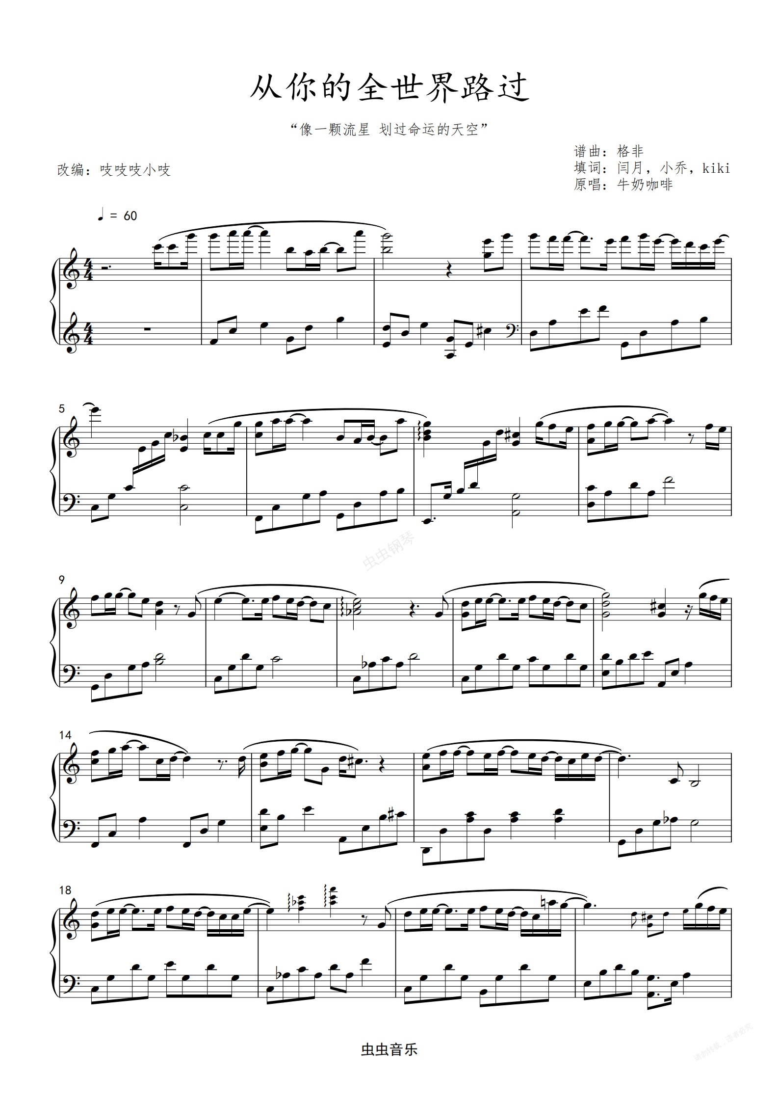 钢琴谱:从你的全世界路过 牛奶咖啡 C调初级版