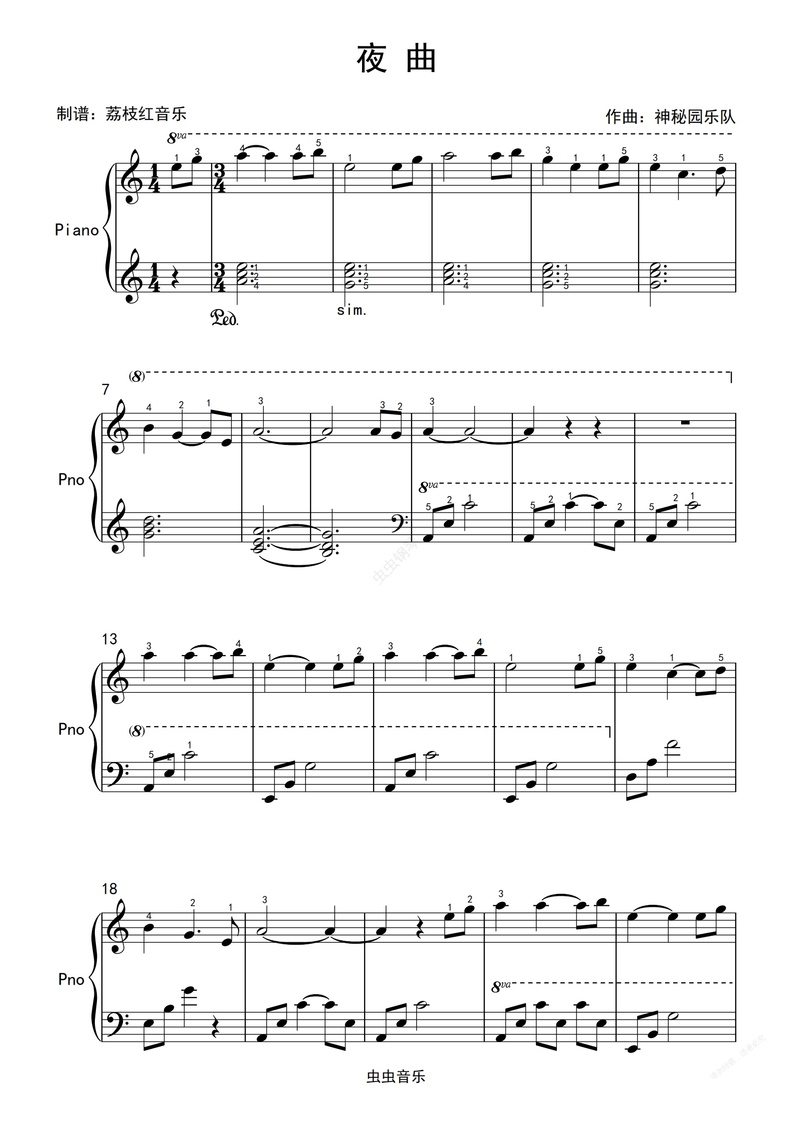 钢琴谱:神秘园乐队 夜曲 经典独奏钢琴谱 C大调 带指法 非常好听