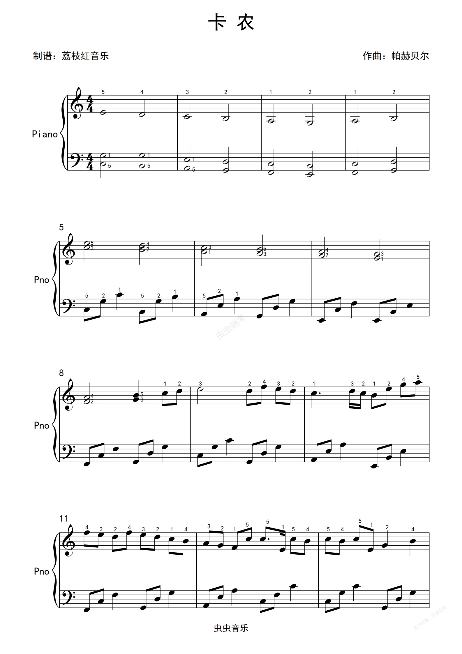 钢琴谱:帕赫贝尔 卡农 C大调带指法独奏钢琴谱 简单易学 初学必弹