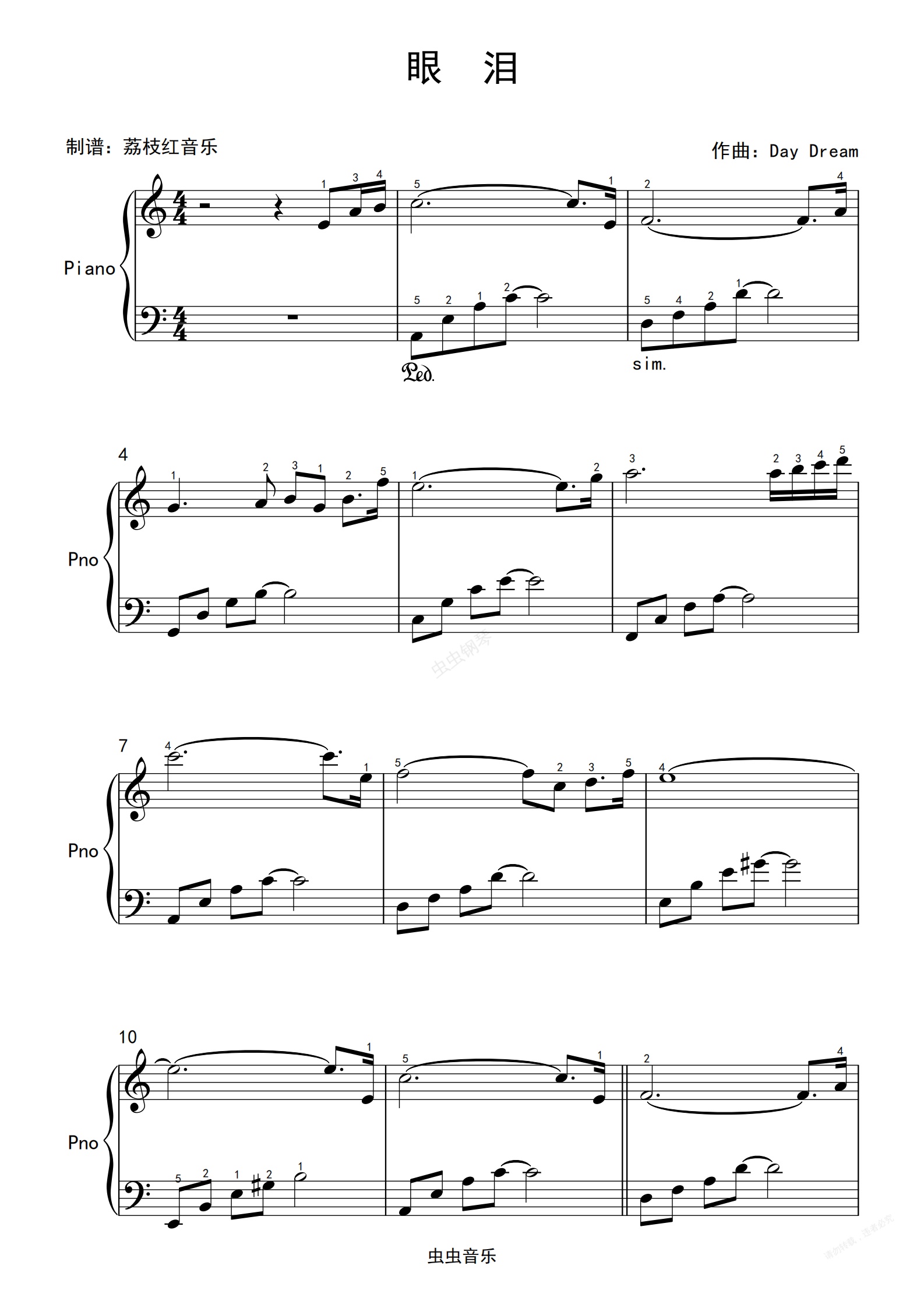 钢琴谱:完整版 带指法C调 Day Dream 眼泪Tear 独奏钢琴谱 高清乐谱