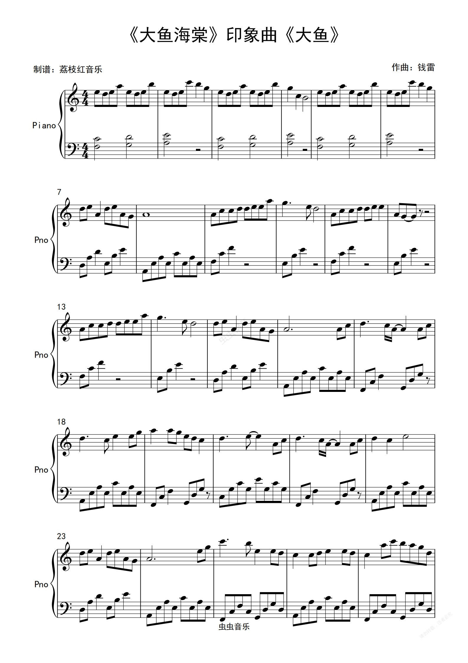 钢琴谱:C大调 简版 大鱼海棠 印象曲《大鱼》 独奏钢琴谱