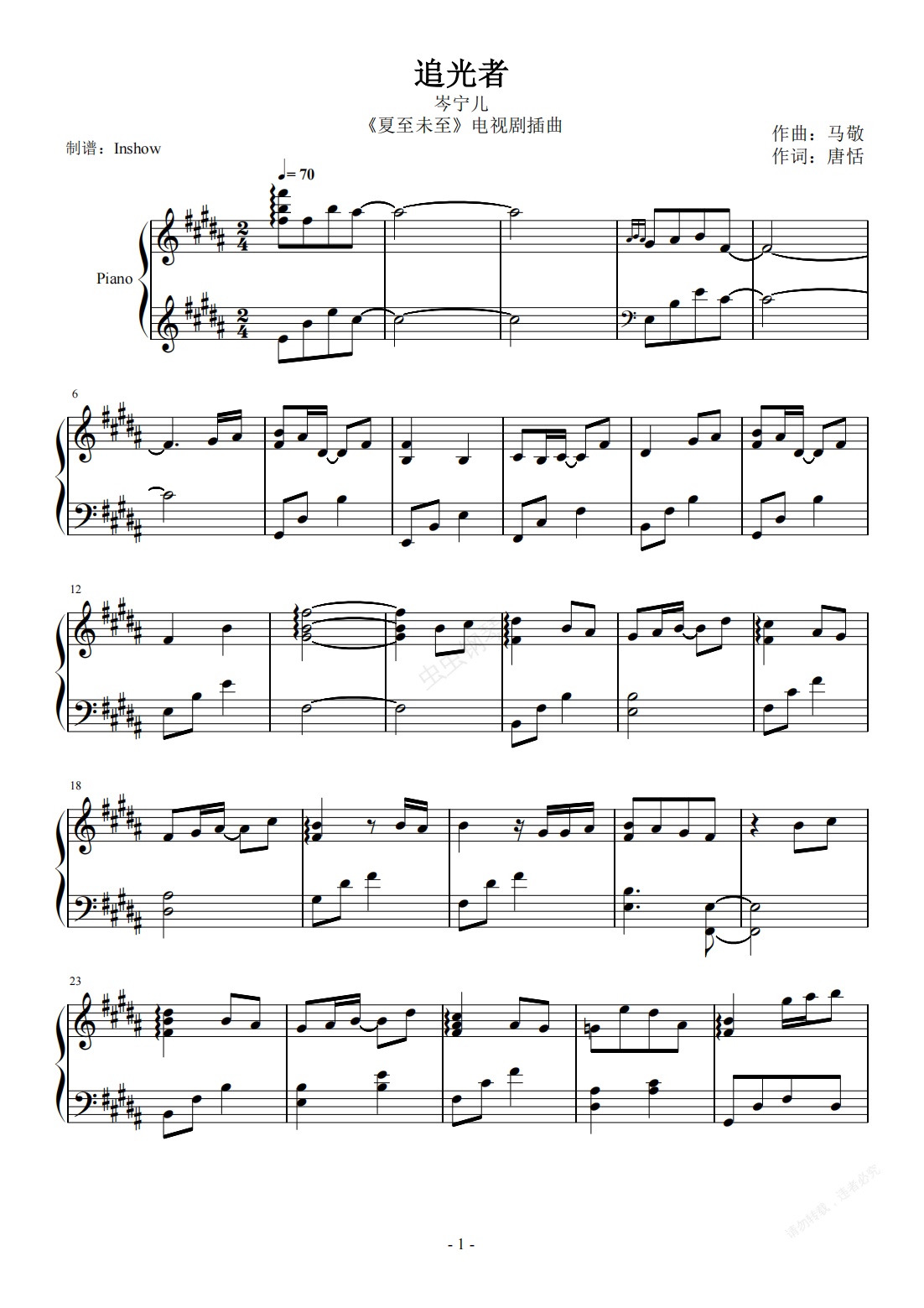 钢琴谱:岑宁儿 - 追光者【完整独奏】(《夏至未至》电视剧插曲)