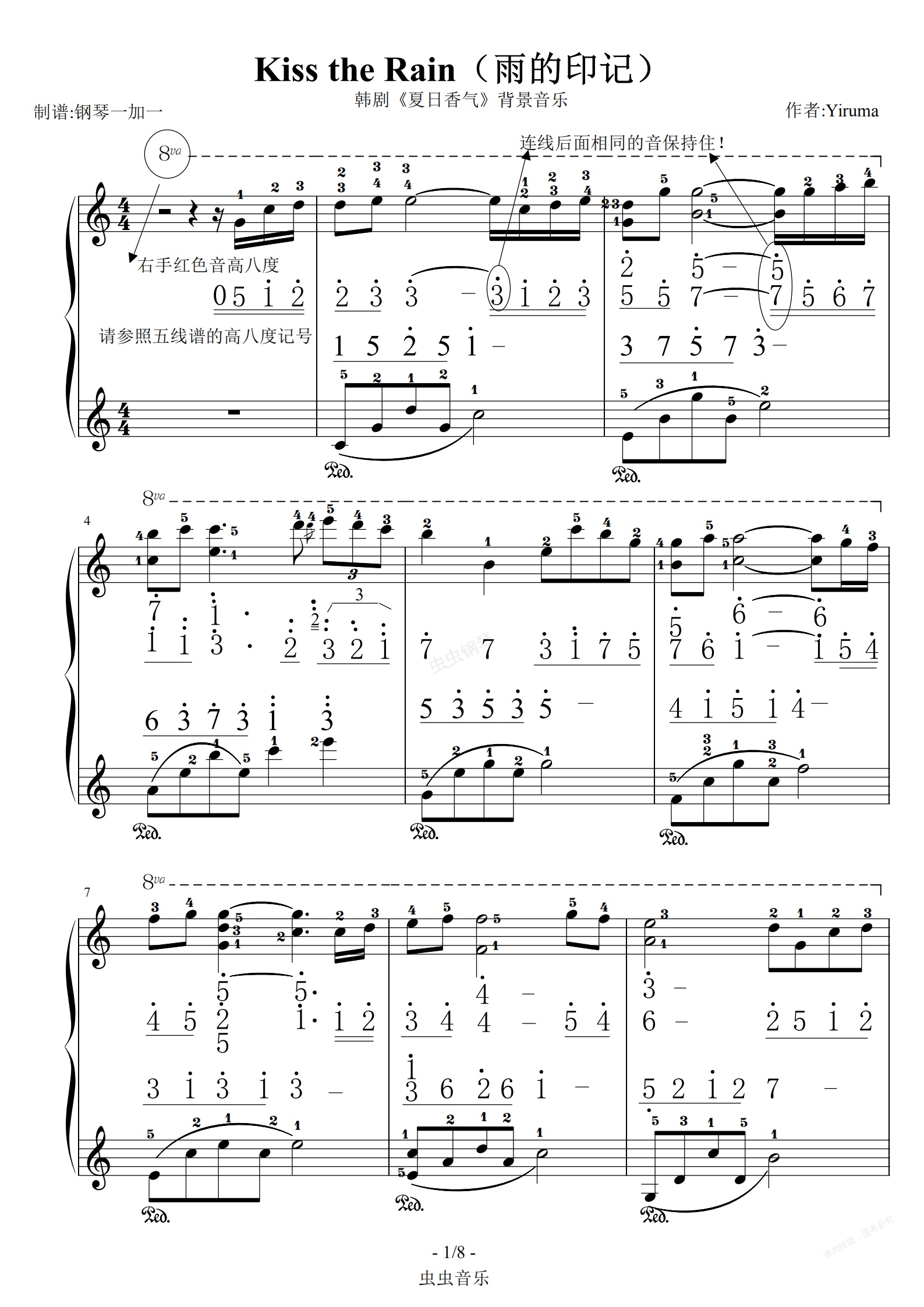 钢琴谱:雨的印记kiss the Rain(夏日香气)背景音乐双谱带指法C调转A调